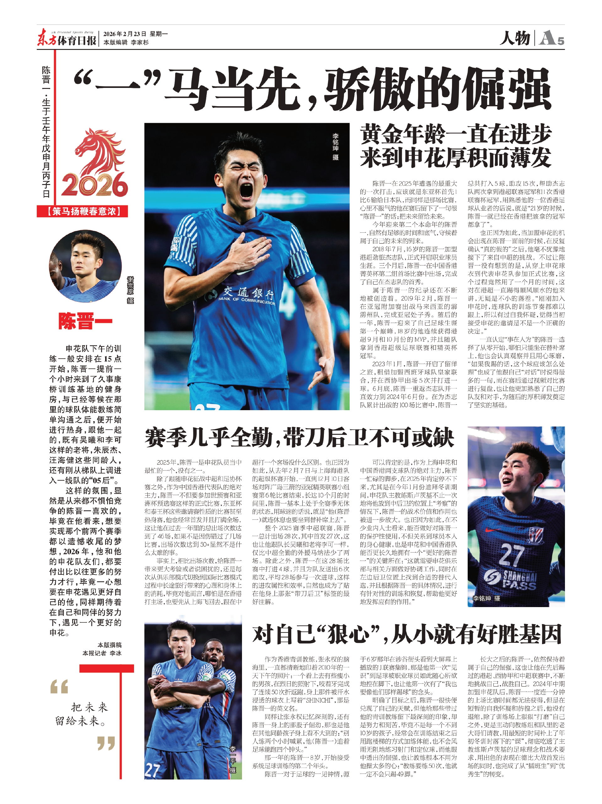 可以肯定的是,作为上海申花和中国香港两支球队的绝对主力,陈晋一忙碌的脚步,在2026年肯定停不下来,尤其是在今年1月份迪拜冬训期间,申花队主教练斯卢茨基不止一次地将他放到中后卫的位置上“考察”的情况下,陈晋一的战术价值和作用也被进一步放大。也正因为如此,在不少业内人士看来,能否做好对陈晋一的保护性使用,不但关系到球员本人的身心健康,也是申花和中国香港队能否更长久地拥有一个“更好的陈晋一”的关键所在:“这就需要申花俱乐部与相关方面做好协调工作,同时在左边后卫位置上找到合适的替代人选,并且根据陈晋一的具体情况,进行有针对性的训练和恢复,帮助他更好地发挥应有的作用。”