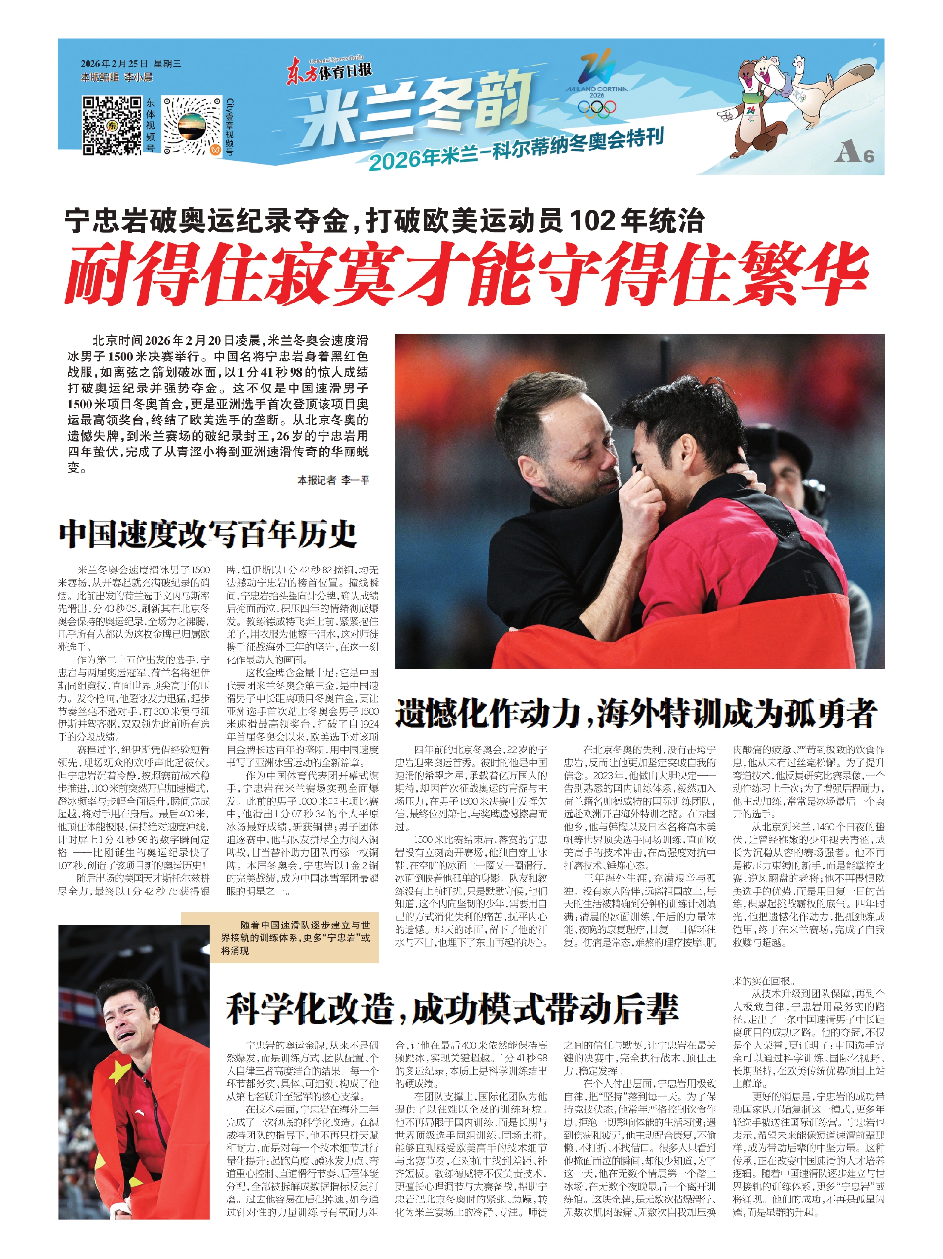 北京时间2026年2月20日凌晨,米兰冬奥会速度滑冰男子1500米决赛举行。中国名将宁忠岩身着黑红色战服,如离弦之箭划破冰面,以1分41秒98的惊人成绩打破奥运纪录并强势夺金。这不仅是中国速滑男子1500米项目冬奥首金,更是亚洲选手首次登顶该项目奥运最高领奖台,终结了欧美选手的垄断。从北京冬奥的遗憾失牌,到米兰赛场的破纪录封王,26岁的宁忠岩用四年蛰伏,完成了从青涩小将到亚洲速滑传奇的华丽蜕变。