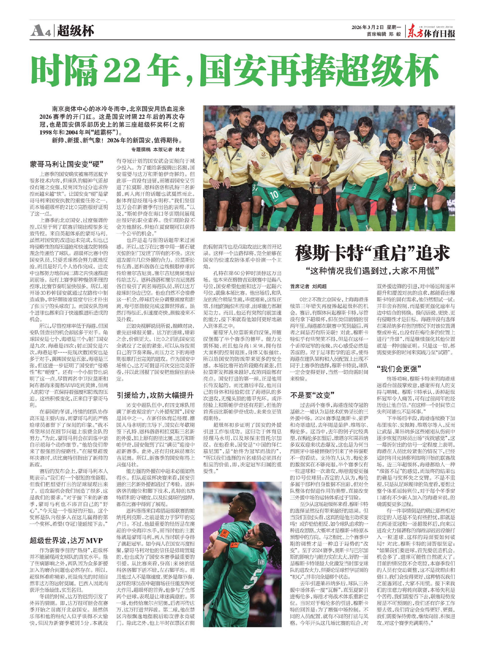 南京奥体中心的冰冷冬雨中,北京国安用热血迎来2026赛季的开门红。这是国安时隔22年后的再次夺冠,也是国安俱乐部历史上的第三座超级杯奖杯(之前1998年和2004年叫“超霸杯”)。