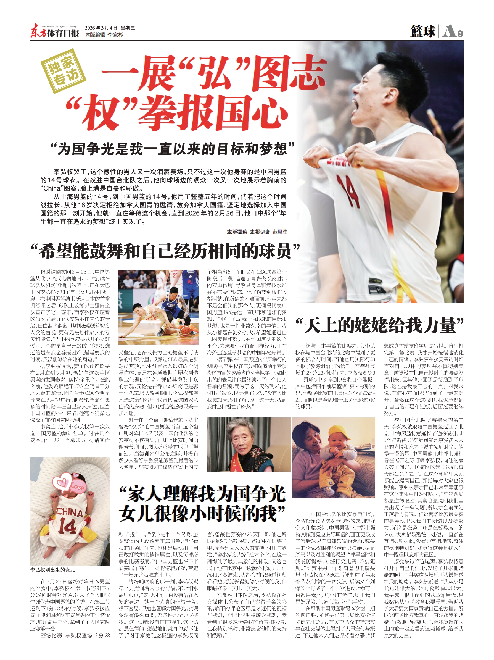 将时钟倒拨回2月23日,中国男篮从北京飞抵比赛地日本冲绳,就在球队从机场到酒店的路上,正在大巴上的李弘权得知了自己女儿出生的消息。在中国男篮结束抵达日本的首堂训练课之后,球队主教练郭士强向全队宣布了这一喜讯,而李弘权在短暂的激动之后,再也按捺不住内心的情绪,任由泪水滑落,其中既蕴藏着初为人父的喜悦,更有无法陪伴家人的亏欠和遗憾,“当下的反应是既开心又难过。开心的是自己升级做了爸爸,难过的是在我老婆最困难、最需要我的时候,我没能够陪在她的身边。”