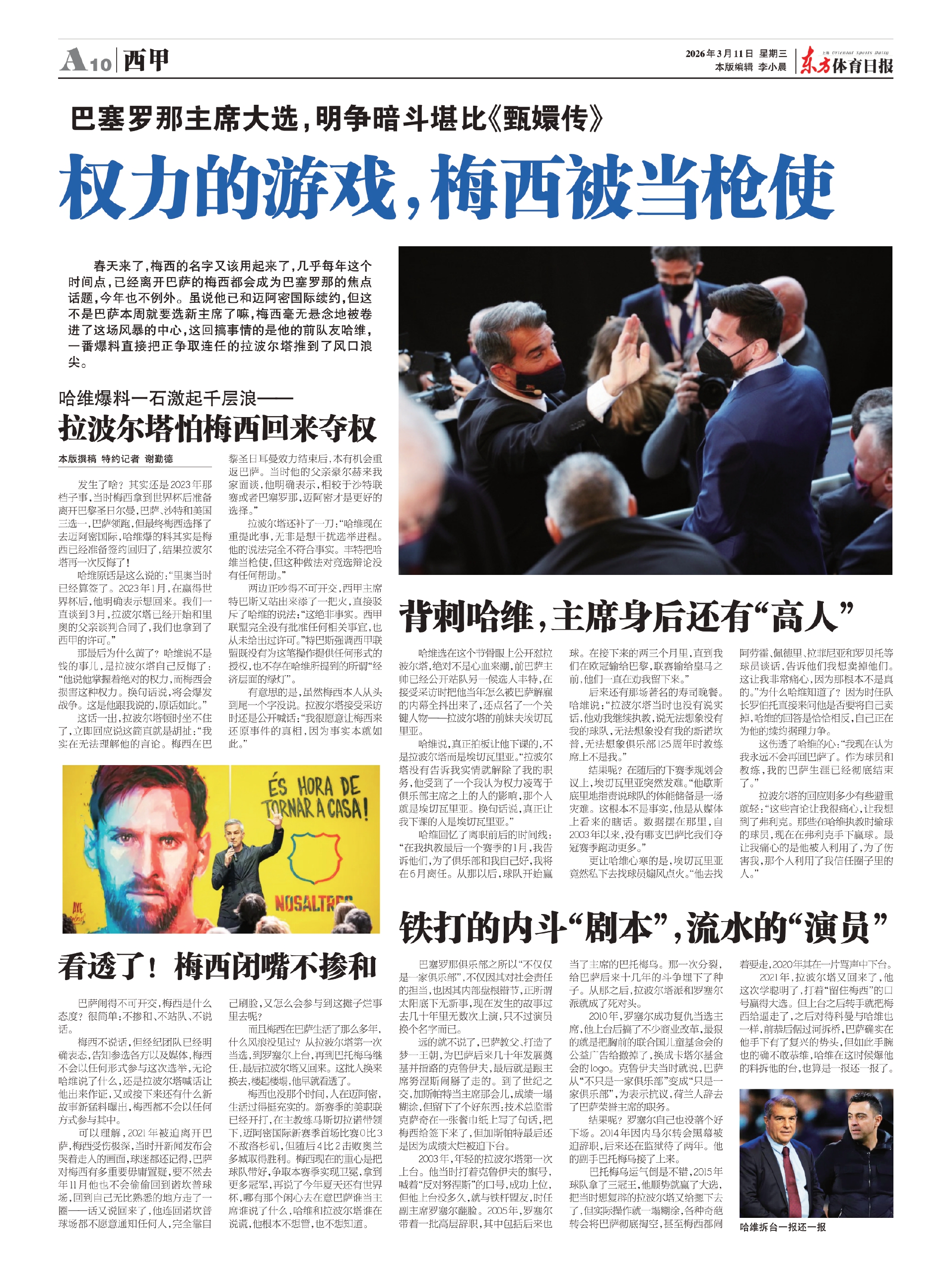 春天来了,梅西的名字又该用起来了,几乎每年这个时间点,已经离开巴萨的梅西都会成为巴塞罗那的焦点话题,今年也不例外。虽说他已和迈阿密国际续约,但这不是巴萨本周就要选新主席了嘛,梅西毫无悬念地被卷进了这场风暴的中心,这回搞事情的是他的前队友哈维,一番爆料直接把正争取连任的拉波尔塔推到了风口浪尖。