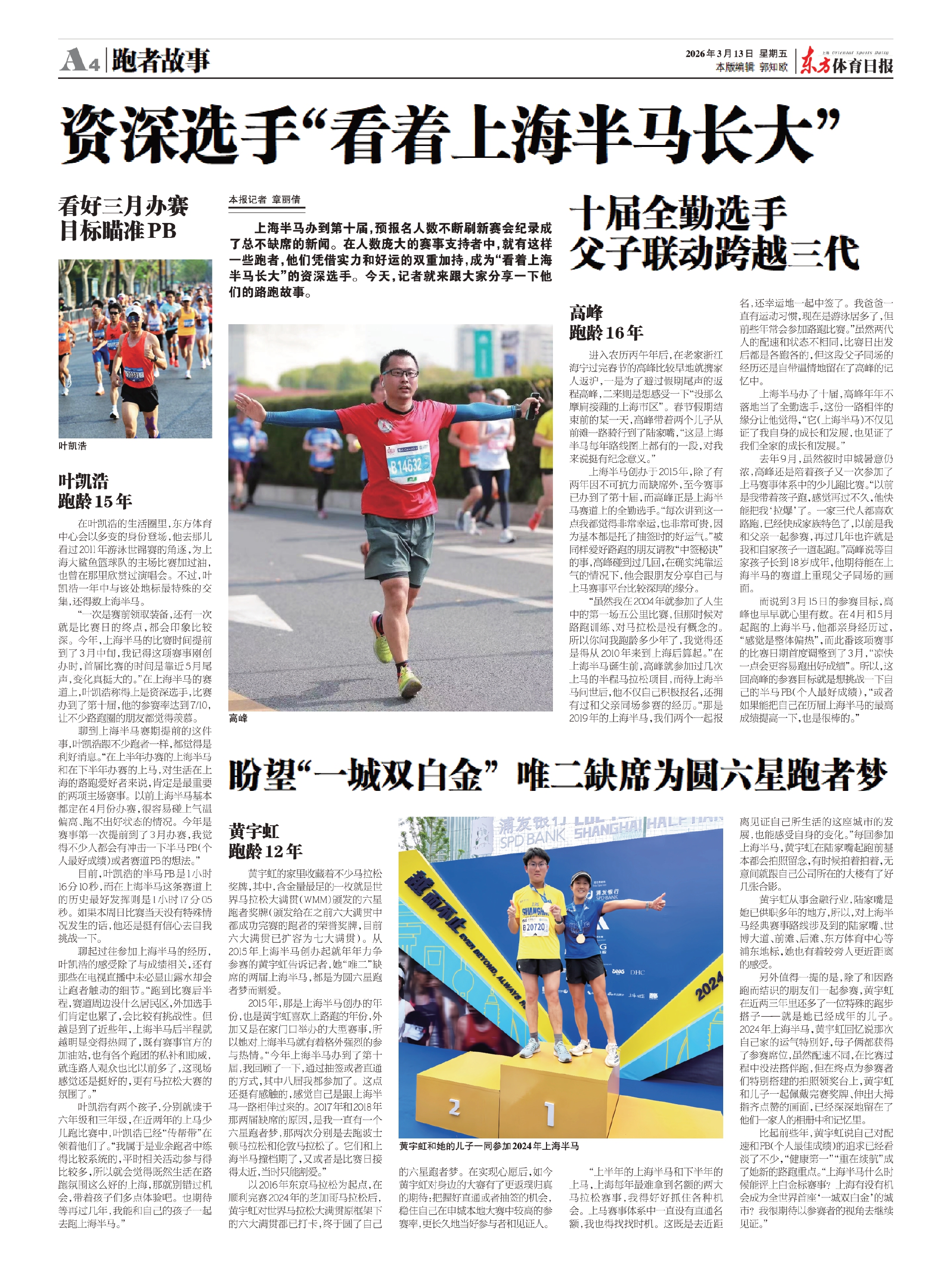 比起前些年,黄宇虹说自己对配速和PB(个人最佳成绩)的追求已经看淡了不少,“健康第一”“重在续航”成了她新的路跑重点。“上海半马什么时候能评上白金标赛事?上海有没有机会成为全世界首座‘一城双白金’的城市?我很期待以参赛者的视角去继续见证。”
