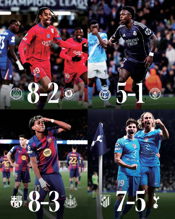 去年夏天,切尔西曾在世俱杯决赛暴打巴黎圣日耳曼,风水轮流转,这次大巴黎完美复仇,首回合5比2,次回合3比0,切尔西吃下队史在欧战淘汰赛的最大两回合败仗。纽卡斯尔对阵巴塞罗那,首回合主场1比1逼平对手表现尚可,次回合到了诺坎普就一塌糊涂了,输了个2比7,总比分3比8。巴萨创下本赛季欧冠淘汰赛单场进球纪录。