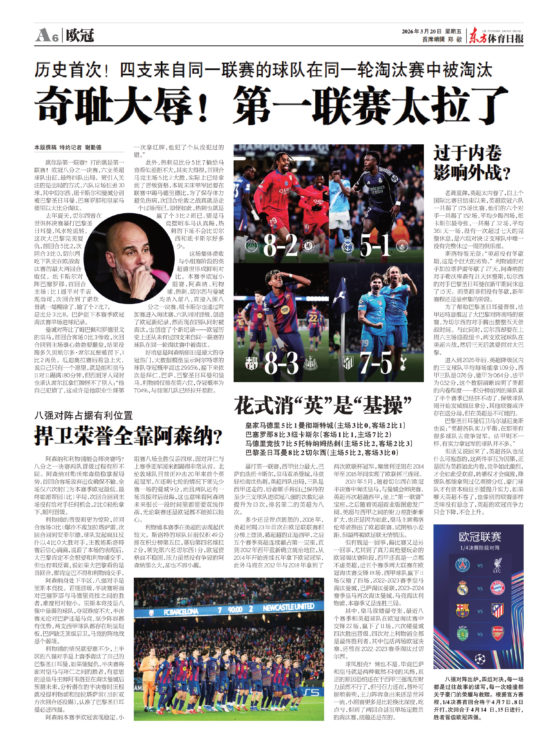暴打第一联赛,西甲出力最大,巴萨血洗纽卡斯尔,皇马双杀曼城,马竞轻松淘汰热刺,英超四队出局,三队是西甲送走的,后者顺手将自己保持的至少三支球队进欧冠八强的次数纪录提升为13次,排名第二的英超为八次。