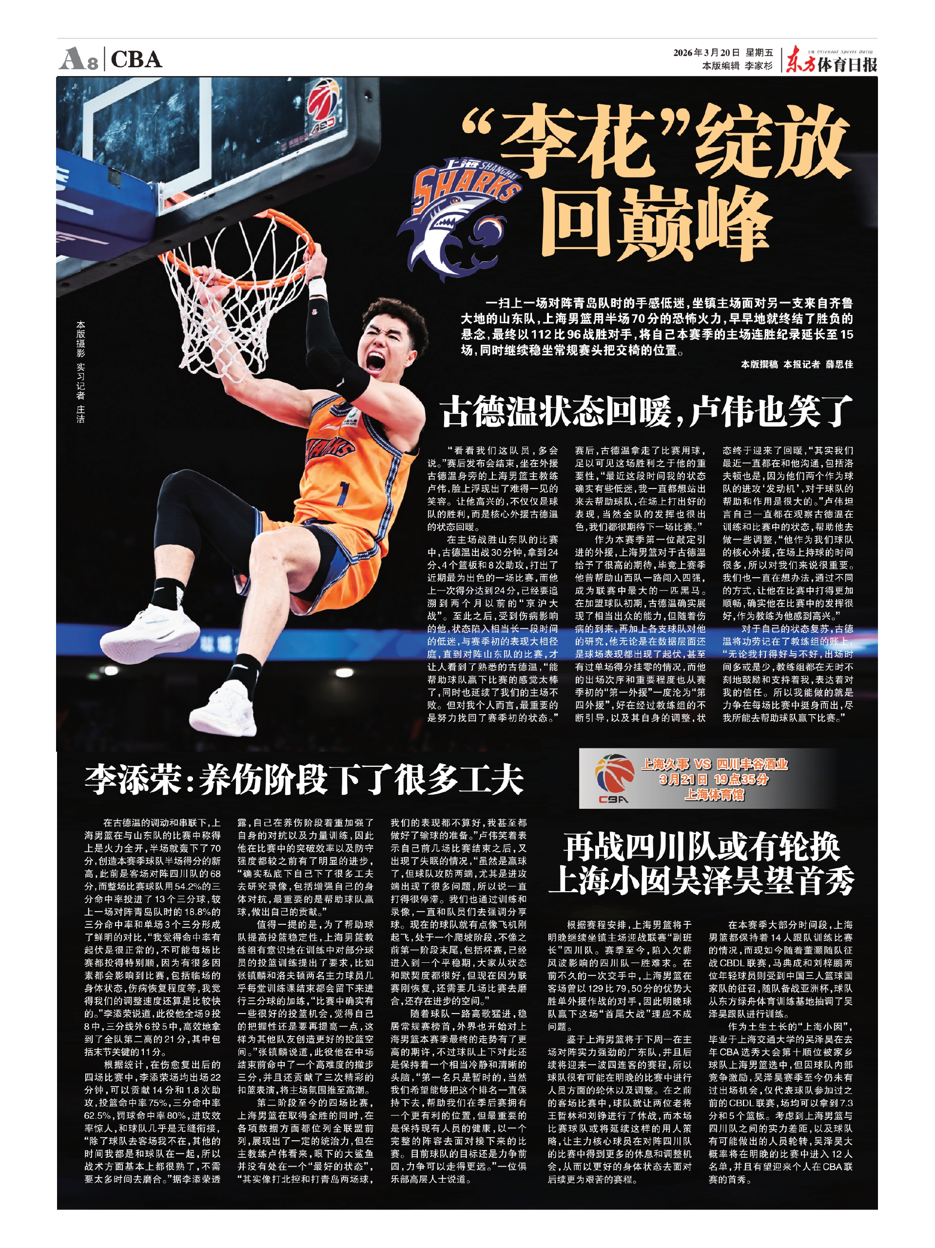 作为土生土长的“上海小囡”,毕业于上海交通大学的吴泽昊在去年CBA选秀大会第十顺位被家乡球队上海男篮选中,但因球队内部竞争激励,吴泽昊赛季至今仍未有过出场机会,仅代表球队参加过之前的CBDL联赛,场均可以拿到7.3分和5个篮板。考虑到上海男篮与四川队之间的实力差距,以及球队有可能做出的人员轮转,吴泽昊大概率将在明晚的比赛中进入12人名单,并且有望迎来个人在CBA联赛的首秀。