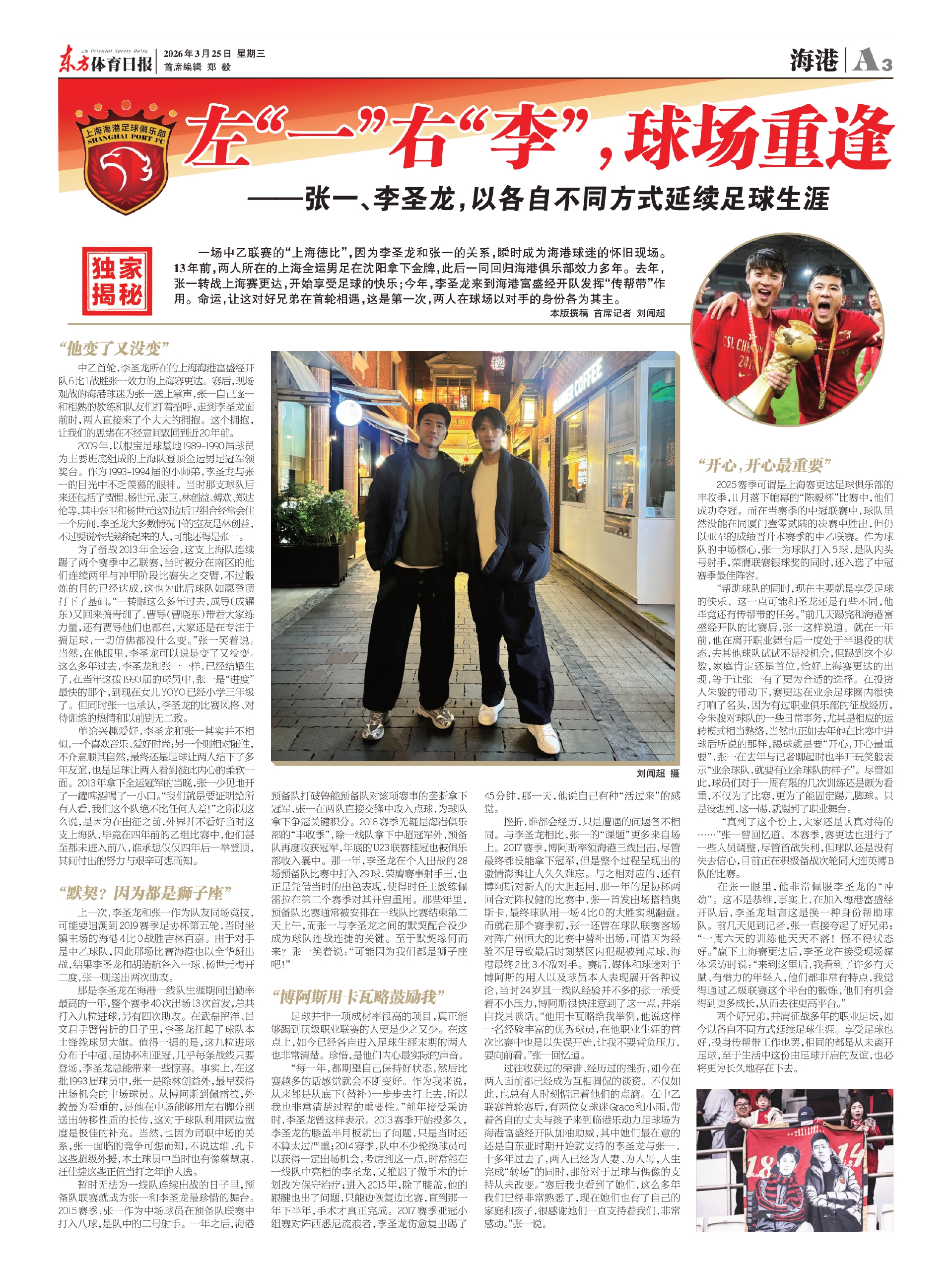 过往收获过的荣誉、经历过的挫折,如今在两人面前都已经成为互相调侃的谈资。不仅如此,也总有人时刻惦记着他们的点滴。在中乙联赛首轮赛后,有两位女球迷Grace和小雨,带着各自的丈夫与孩子来到临港乐动力足球场为海港富盛经开队加油助威,其中她们最在意的还是自东亚时期开始就支持的李圣龙与张一,十多年过去了,两人已经为人妻、为人母,人生完成“转场”的同时,那份对于足球与偶像的支持从未改变。“赛后我也看到了她们,这么多年我们已经非常熟悉了,现在她们也有了自己的家庭和孩子,很感谢她们一直支持着我们,非常感动。”张一说。
