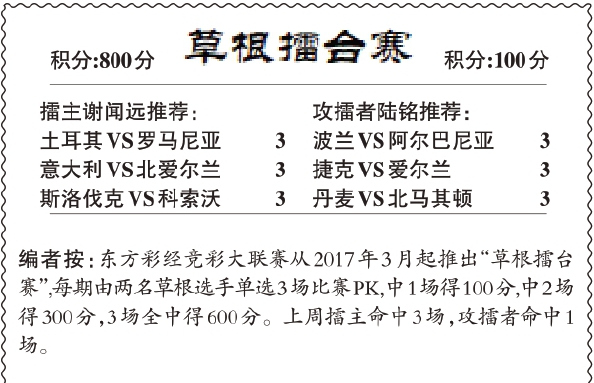 本报记者 邓睿侃 整理 “竞彩大擂台”新一季比赛拉开帷幕,全新阵容整装出发,体彩网点业主为广大彩民出谋划策。谁能赢得广大彩民的信任?谁能在红榜长期霸榜?敬请持续关注竞彩大联赛。