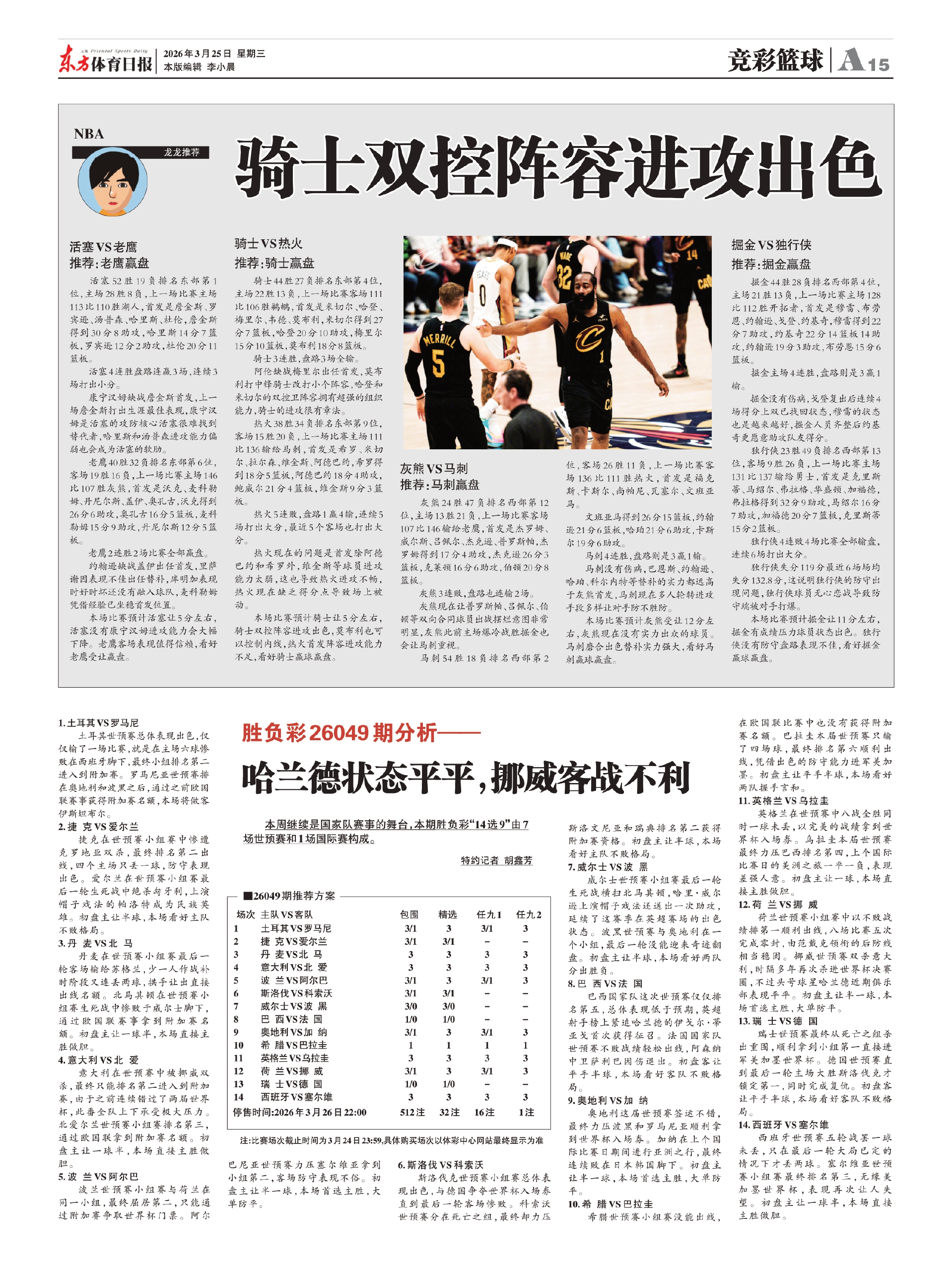 本场比赛预计骑士让5分左右,骑士双控阵容进攻出色,莫布利也可以控制内线,热火首发阵容进攻能力不足,看好骑士赢球赢盘。