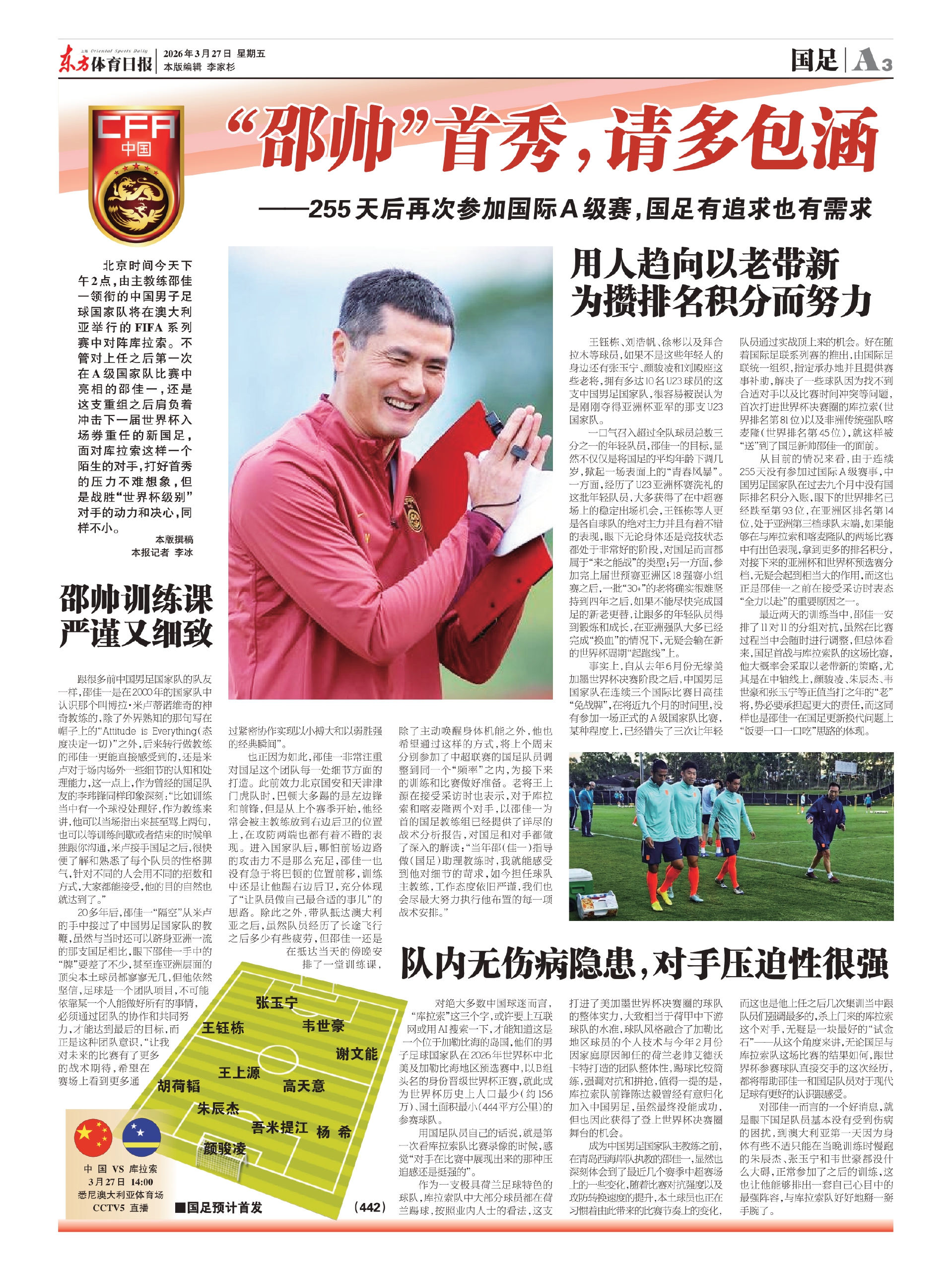 也正因为如此,邵佳一非常注重对国足这个团队每一处细节方面的打造。此前效力北京国安和天津津门虎队时,巴顿大多踢的是左边锋和前锋,但是从上个赛季开始,他经常会被主教练放到右边后卫的位置上,在攻防两端也都有着不错的表现。进入国家队后,哪怕前场边路的攻击力不是那么充足,邵佳一也没有急于将巴顿的位置前移,训练中还是让他踢右边后卫,充分体现了“让队员做自己最合适的事儿”的思路。除此之外,带队抵达澳大利亚之后,虽然队员经历了长途飞行之后多少有些疲劳,但邵佳一还是在抵达当天的傍晚安排了一堂训练课,除了主动唤醒身体机能之外,他也希望通过这样的方式,将上个周末分别参加了中超联赛的国足队员调整到同一个“频率”之内,为接下来的训练和比赛做好准备。老将王上源在接受采访时也表示,对于库拉索和喀麦隆两个对手,以邵佳一为首的国足教练组已经提供了详尽的战术分析报告,对国足和对手都做了深入的解读:“当年邵(佳一)指导做(国足)助理教练时,我就能感受到他对细节的苛求,如今担任球队主教练,工作态度依旧严谨,我们也会尽最大努力执行他布置的每一项战术安排。”