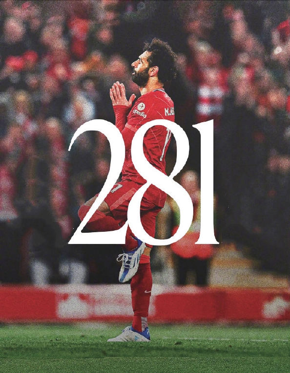 萨拉赫在英超为利物浦贡献189粒进球和92次助攻。共281球是英超联赛历史上球员为单一俱乐部的进球参与数最高纪录