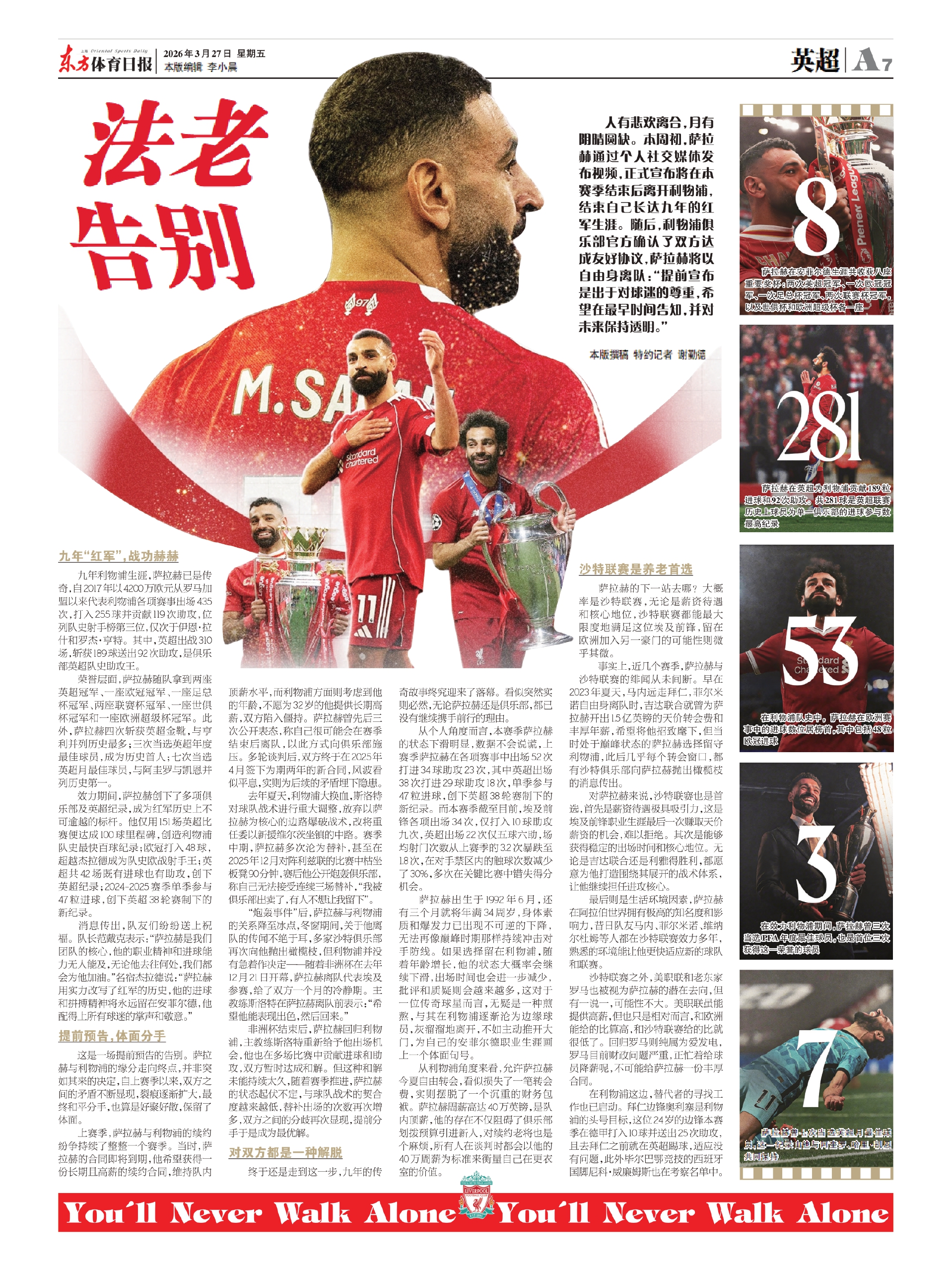 萨拉赫出生于1992年6月,还有三个月就将年满34周岁,身体素质和爆发力已出现不可逆的下降,无法再像巅峰时期那样持续冲击对手防线。如果选择留在利物浦,随着年龄增长,他的状态大概率会继续下滑,出场时间也会进一步减少,批评和质疑则会越来越多,这对于一位传奇球星而言,无疑是一种煎熬,与其在利物浦逐渐沦为边缘球员,灰溜溜地离开,不如主动推开大门,为自己的安菲尔德职业生涯画上一个体面句号。