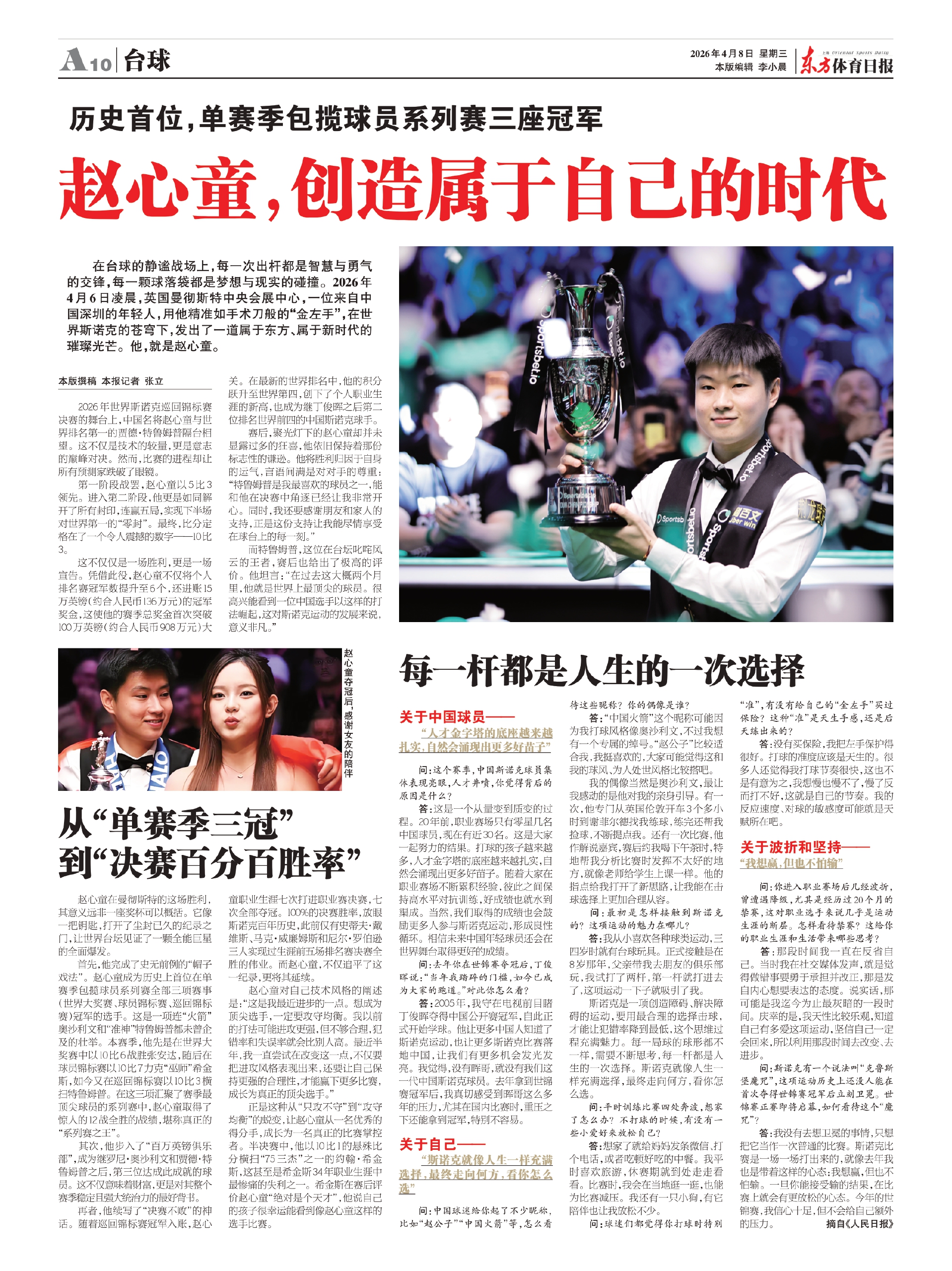 在台球的静谧战场上,每一次出杆都是智慧与勇气的交锋,每一颗球落袋都是梦想与现实的碰撞。2026年4月6日凌晨,英国曼彻斯特中央会展中心,一位来自中国深圳的年轻人,用他精准如手术刀般的“金左手”,在世界斯诺克的苍穹下,发出了一道属于东方、属于新时代的璀璨光芒。他,就是赵心童。