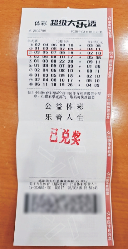 3月30日,超级大乐透第26033开奖。前区开出号码03、05、07、09、18;后区开出号码02、10。当期,位于上海浦东新区航头镇航昌路481号,编号为12861的体彩代销网点中出一注大乐透基本一等奖,中奖票面为一张面值200元的10注直选连购10期的1倍多期票,单票奖金562万余元。