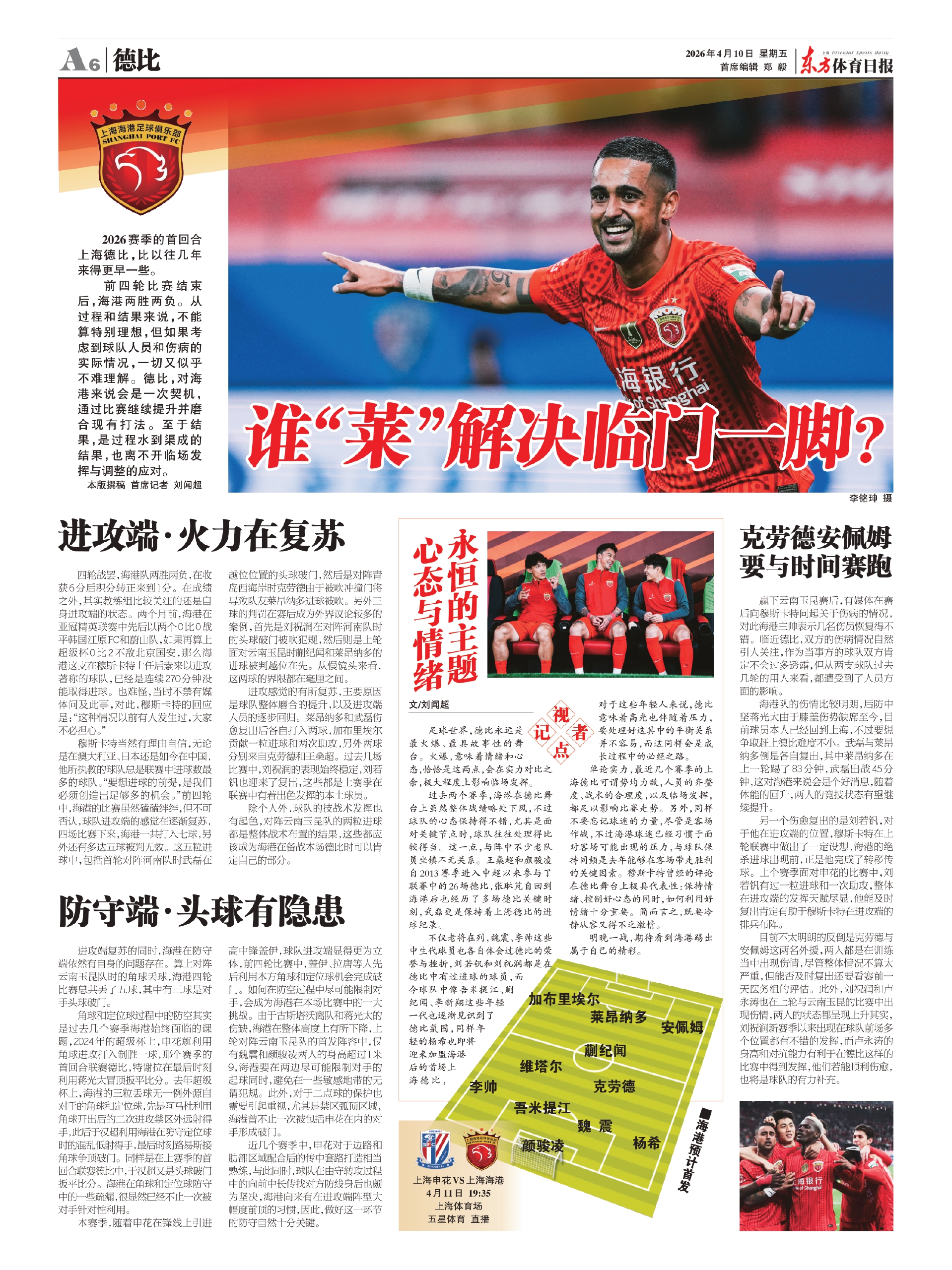 近几个赛季中,申花对于边路和肋部区域配合后的传中套路打造相当熟练,与此同时,球队在由守转攻过程中的向前中长传找对方防线身后也颇为坚决,海港向来有在进攻端阵型大幅度前顶的习惯,因此,做好这一环节的防守自然十分关键。