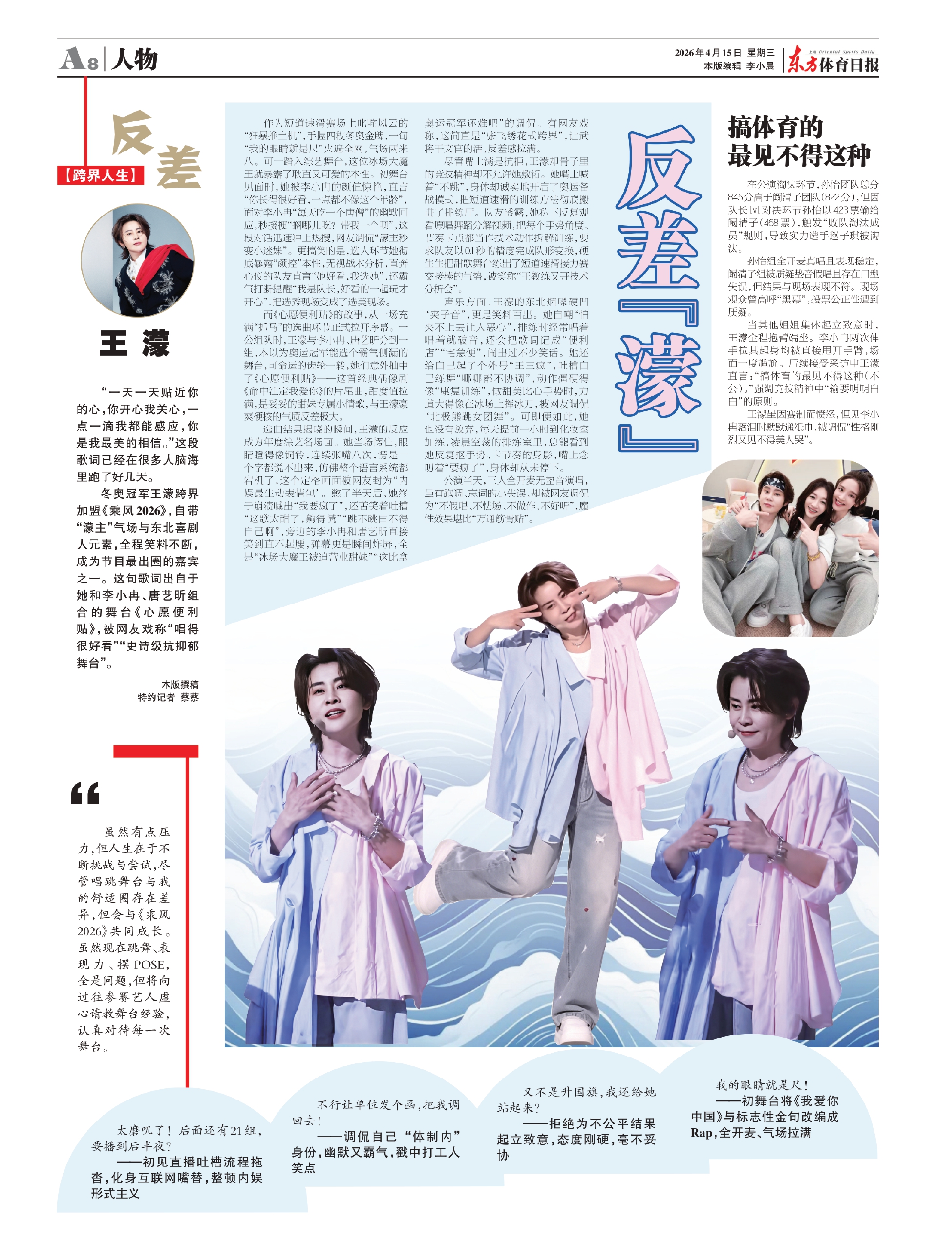 冬奥冠军王濛跨界加盟《乘风2026》,自带“濛主”气场与东北喜剧人元素,全程笑料不断,成为节目最出圈的嘉宾之一。这句歌词出自于她和李小冉、唐艺昕组合的舞台《心愿便利贴》,被网友戏称“唱得很好看”“史诗级抗抑郁舞台”。