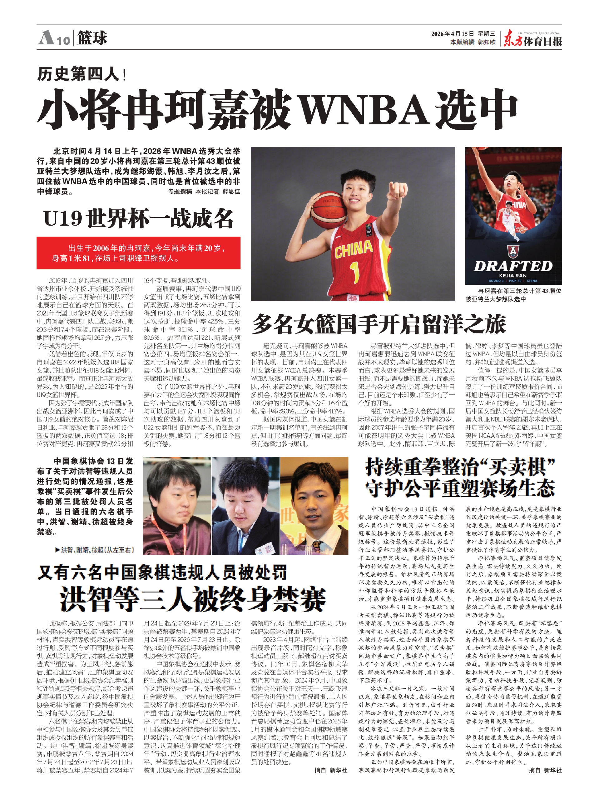 北京时间4月14日上午,2026年WNBA选秀大会举行,来自中国的20岁小将冉珂嘉在第三轮总计第43顺位被亚特兰大梦想队选中,成为继郑海霞、韩旭、李月汝之后,第四位被WNBA选中的中国球员,同时也是首位被选中的非中锋球员。