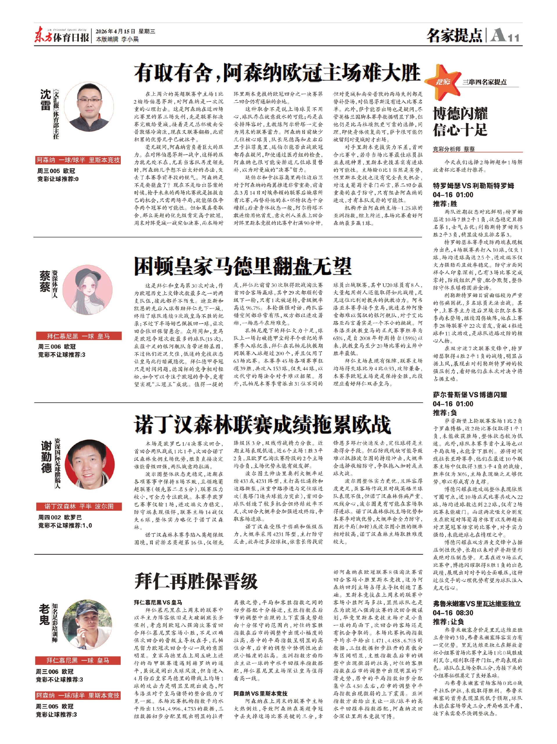 毫无疑问,阿森纳背负着巨大的压力。在对阵伯恩茅斯一战中,这样的压力就无处不在,尤其当客队再度领先时,阿森纳几乎想不出太好的办法,失去了本赛季前半段的锐气。阿森纳是不是要崩盘了?现在不是给出答案的时候,枪手未来的两场比赛就是拯救自己的机会,只需两场平局,就能保住争夺两个冠军的可能性。但如果真要取舍,那么英超的优先级肯定高于欧冠,周末对阵曼城一战宛如决赛,而本场对阵里斯本竞技的欧冠四分之一决赛第二回合仍有通融的余地。