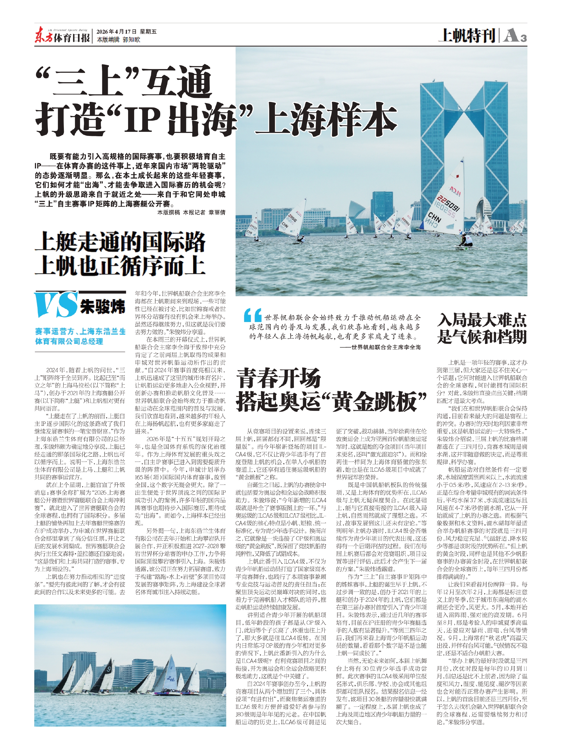 既是中国帆船帆板队的传统强项,又是上海体育的优势所在,ILCA6级与上帆无疑深度契合。在此基础上,能与它直接衔接的ILCA4级入局上帆,自然而然就成了理想之选。不过,故事发展到这儿还未有定论。“等到明年上帆办赛时,ILCA4级会否继续作为青少年项目的代表出现,这还得有一个后期评估的过程。我们在每届上帆赛后都会对竞赛组织、项目设置等进行评估,此后才会产生下一届的方案。”朱骏炜透露道。