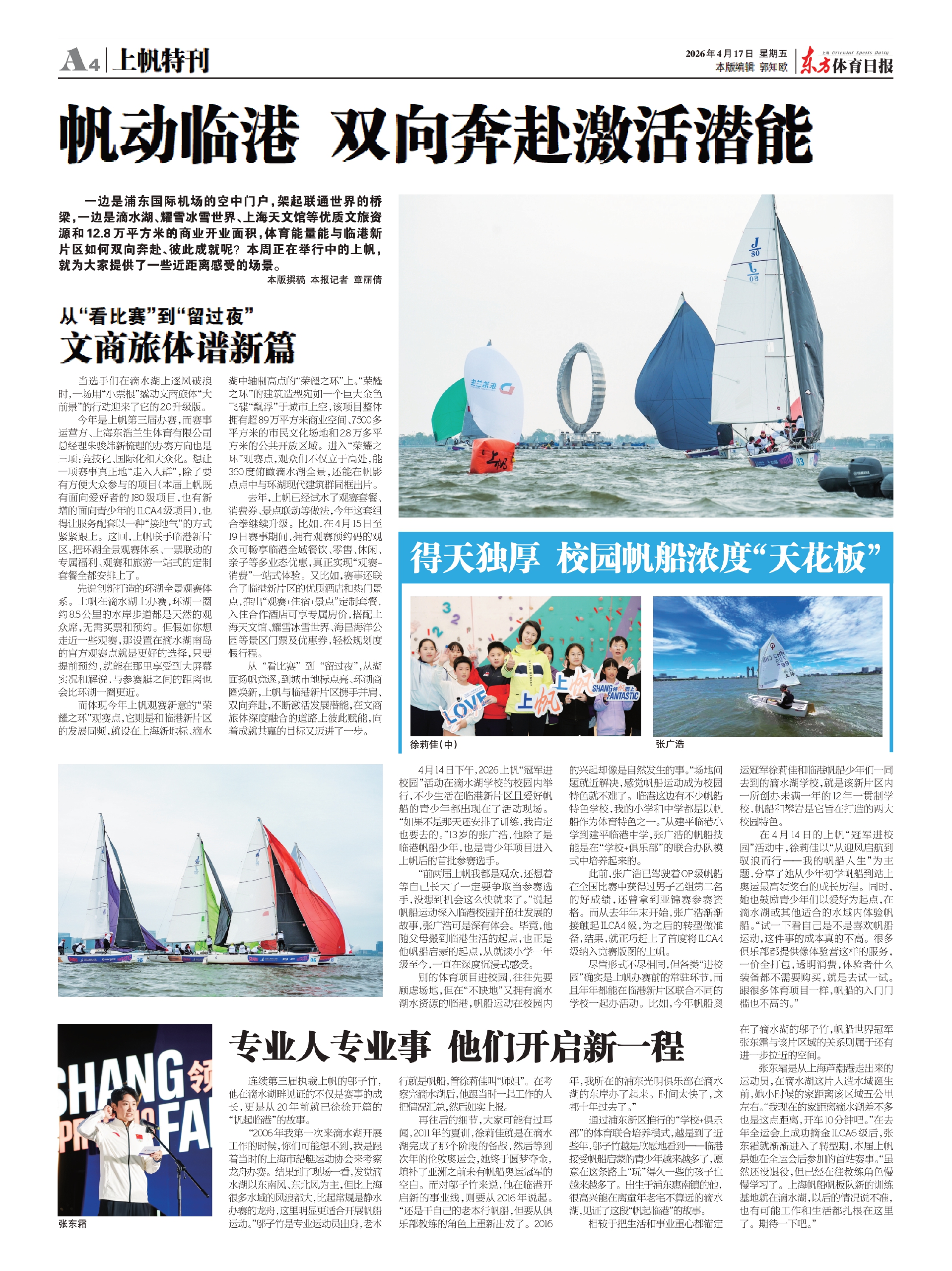4月14日下午,2026上帆“冠军进校园”活动在滴水湖学校的校园内举行,不少生活在临港新片区且爱好帆船的青少年都出现在了活动现场。“如果不是那天还安排了训练,我肯定也要去的。”13岁的张广浩,他除了是临港帆船少年,也是青少年项目进入上帆后的首批参赛选手。