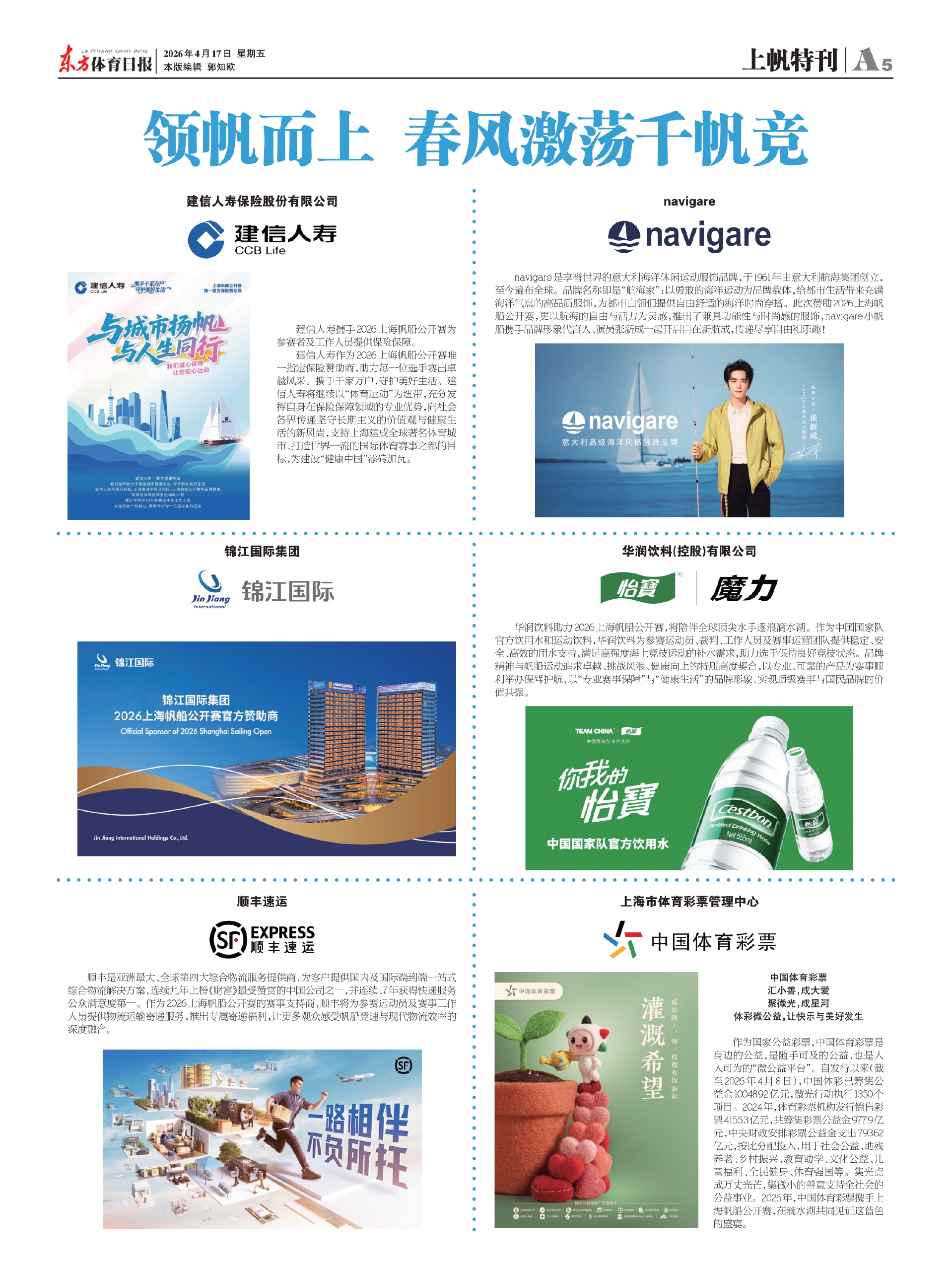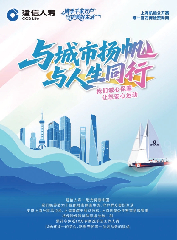 建信人寿作为2026上海帆船公开赛唯一指定保险赞助商,助力每一位选手赛出卓越风采。携手千家万户,守护美好生活。建信人寿将继续以“体育运动”为纽带,充分发挥自身在保险保障领域的专业优势,向社会各界传递坚守长期主义的价值观与健康生活的新风尚,支持上海建成全球著名体育城市、打造世界一流的国际体育赛事之都的目标,为建设“健康中国”添砖加瓦。
