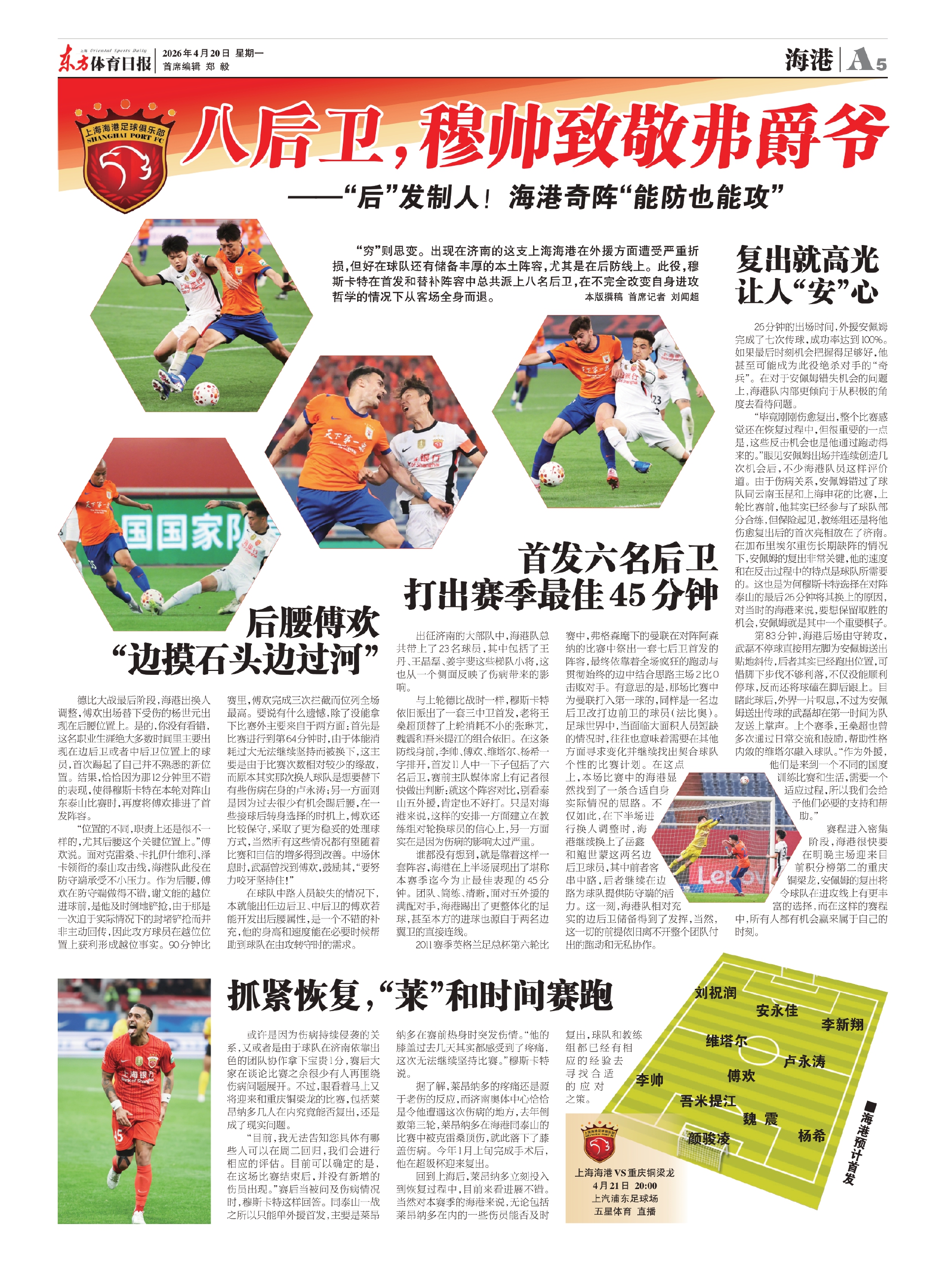 德比大战最后阶段,海港出换人调整,傅欢出场替下受伤的杨世元出现在后腰位置上。是的,你没有看错,这名职业生涯绝大多数时间里主要出现在边后卫或者中后卫位置上的球员,首次踢起了自己并不熟悉的新位置。结果,恰恰因为那12分钟里不错的表现,使得穆斯卡特在本轮对阵山东泰山比赛时,再度将傅欢排进了首发阵容。