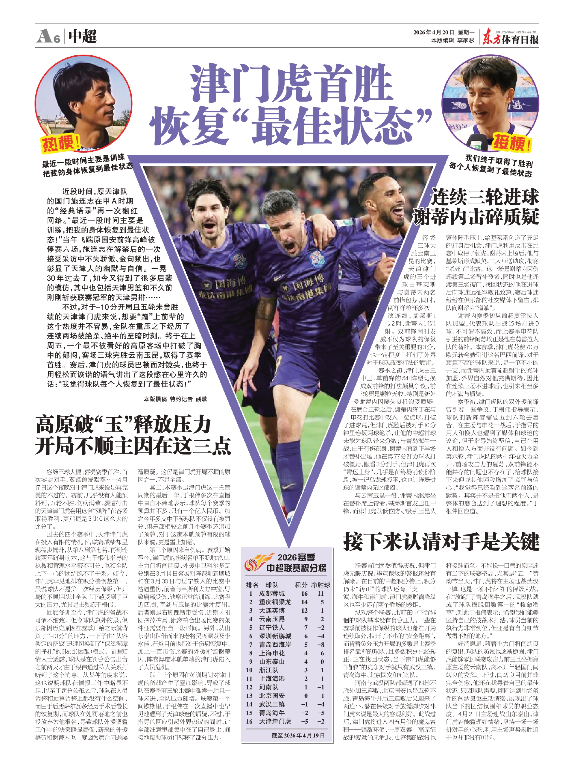 2026赛季中超联赛积分榜 津门虎首胜恢复“最佳状态”
