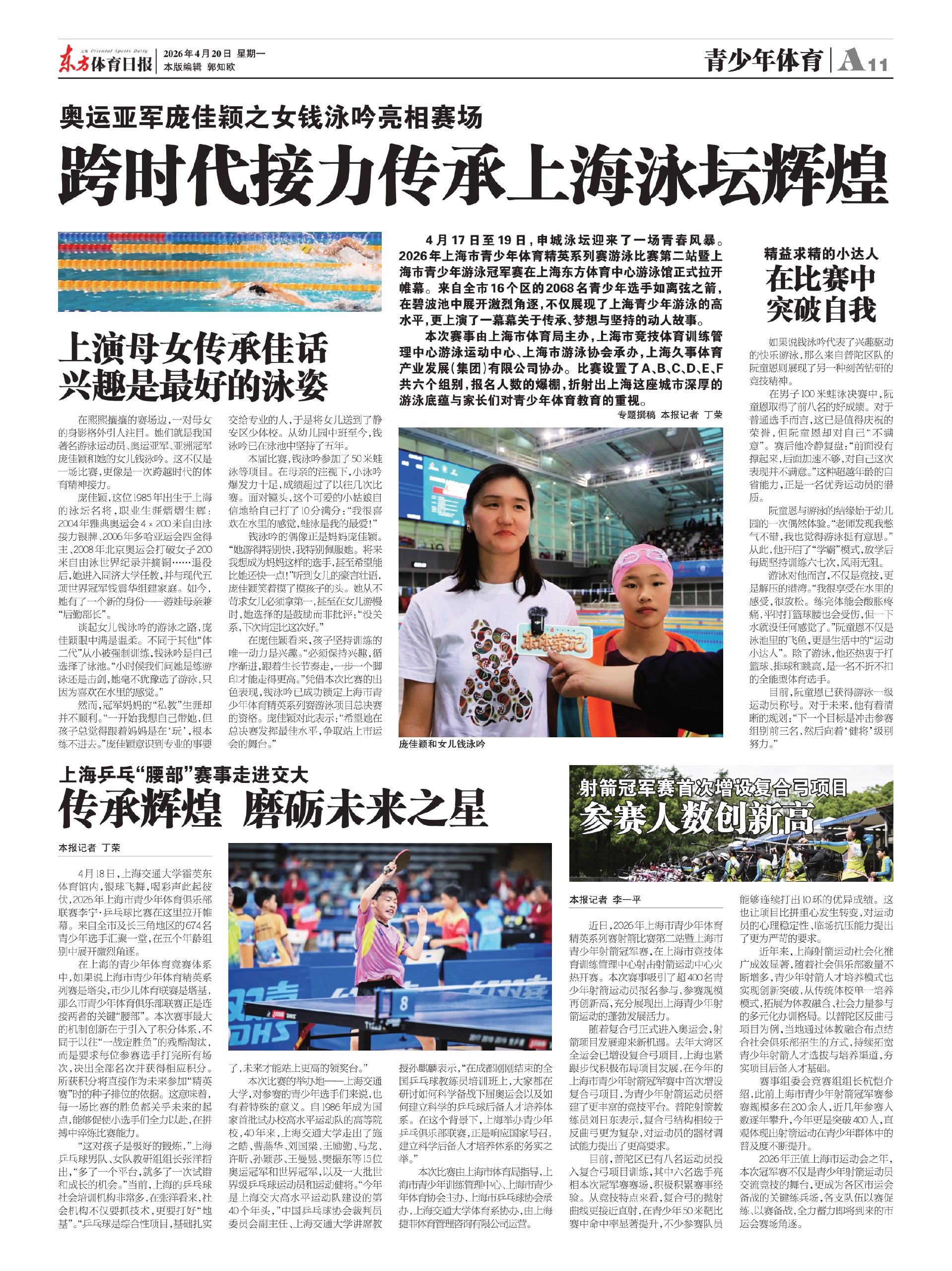 4月17日至19日,申城泳坛迎来了一场青春风暴。2026年上海市青少年体育精英系列赛游泳比赛第二站暨上海市青少年游泳冠军赛在上海东方体育中心游泳馆正式拉开帷幕。来自全市16个区的2068名青少年选手如离弦之箭,在碧波池中展开激烈角逐,不仅展现了上海青少年游泳的高水平,更上演了一幕幕关于传承、梦想与坚持的动人故事。