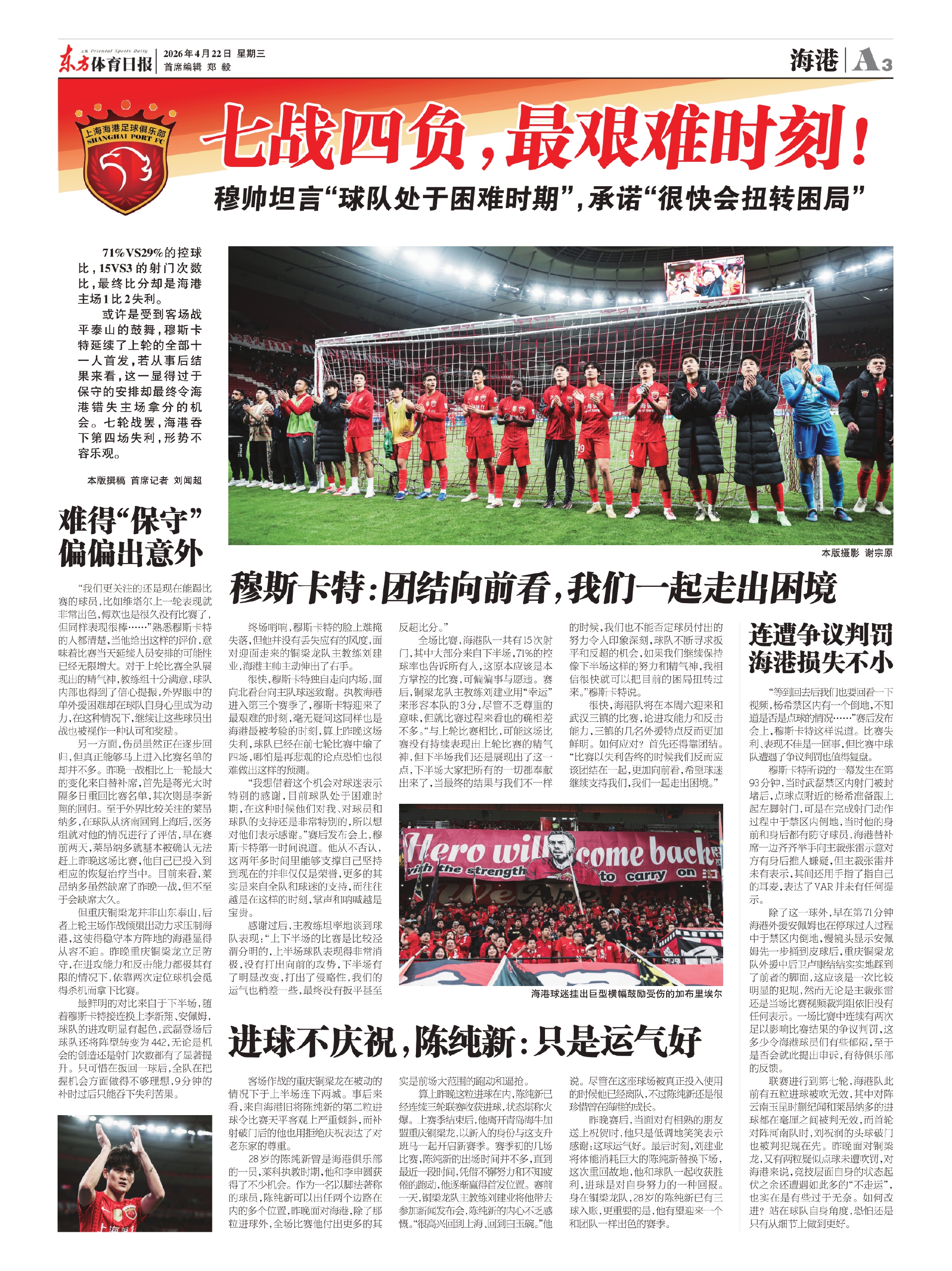 全场比赛,海港队一共有15次射门,其中大部分来自下半场,71%的控球率也告诉所有人,这原本应该是本方掌控的比赛,可偏偏事与愿违。赛后,铜梁龙队主教练刘建业用“幸运”来形容本队的3分,尽管不乏尊重的意味,但就比赛过程来看也的确相差不多。“与上轮比赛相比,可能这场比赛没有持续表现出上轮比赛的精气神,但下半场我们还是展现出了这一点,下半场大家把所有的一切都奉献出来了,当最终的结果与我们不一样的时候,我们也不能否定球员付出的努力令人印象深刻,球队不断寻求扳平和反超的机会,如果我们继续保持像下半场这样的努力和精气神,我相信很快就可以把目前的困局扭转过来。”穆斯卡特说。