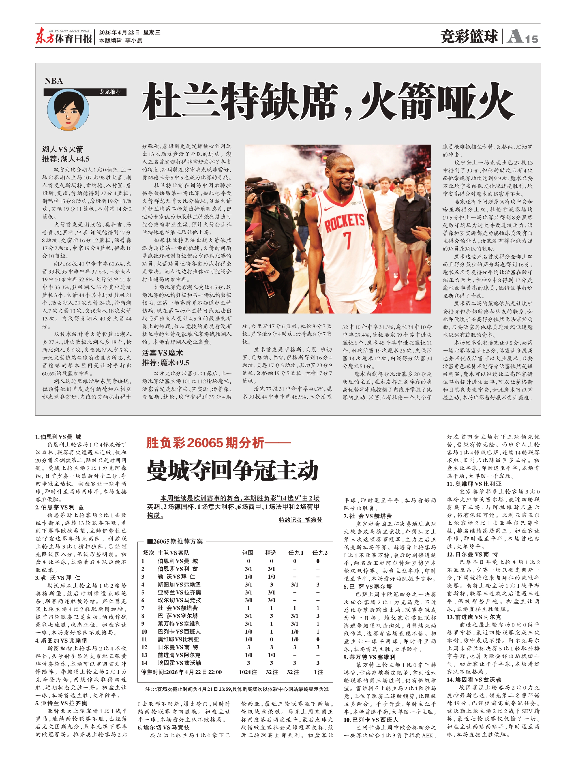 活塞还有个问题是只有坎宁安和哈里斯得分上双,杜伦常规赛场均19.5分但上一场比赛只得到8分显然是防守端压力过大导致进攻乏力,汤普森和罗宾逊都是功能性球员没有自主得分的能力,活塞没有得分能力强的球员是球队的软肋。