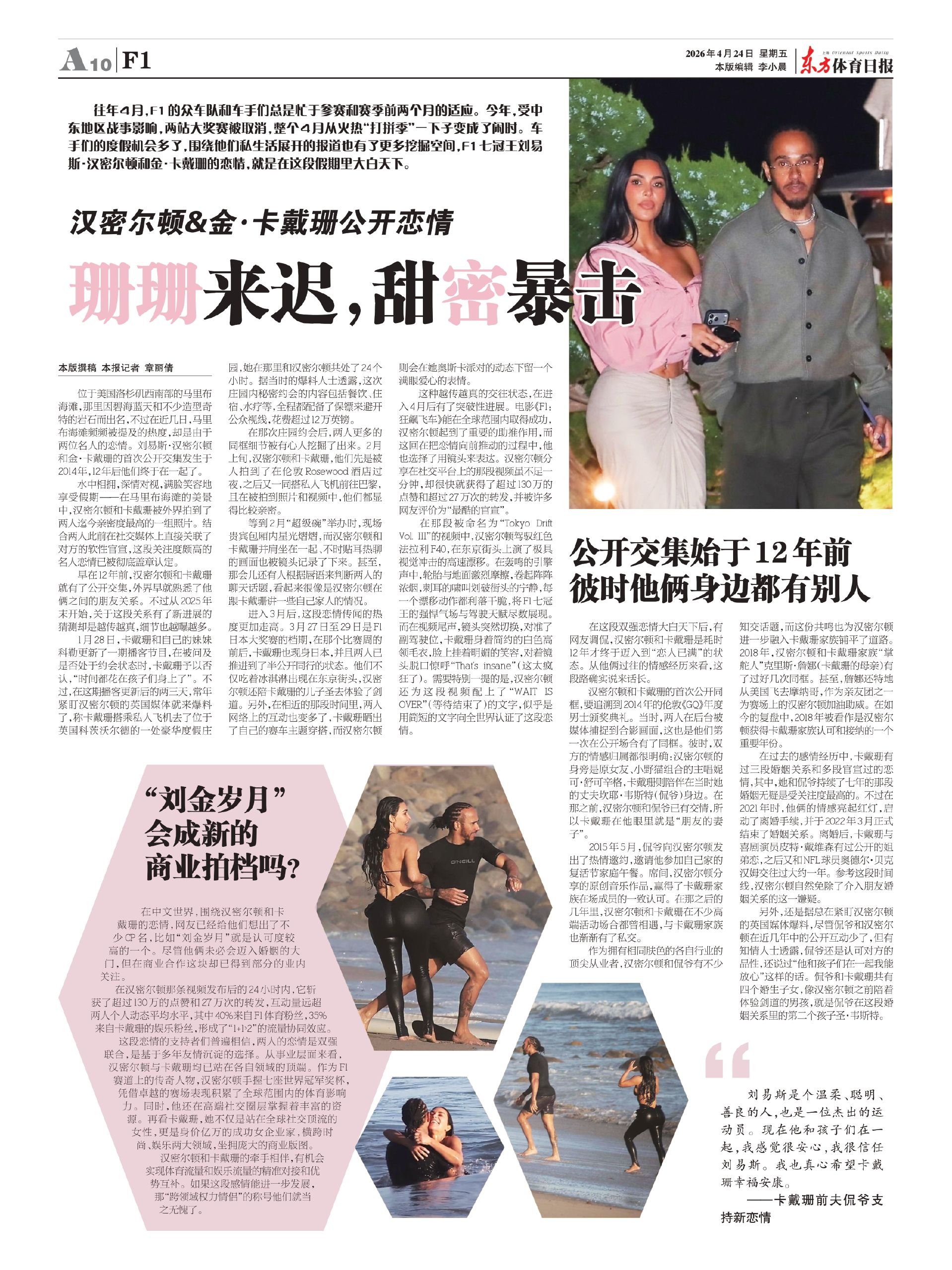 往年4月,F1的众车队和车手们总是忙于参赛和赛季前两个月的适应。今年,受中东地区战事影响,两站大奖赛被取消,整个4月从火热“打拼季”一下子变成了闲时。车手们的度假机会多了,围绕他们私生活展开的报道也有了更多挖掘空间,F1七冠王刘易斯·汉密尔顿和金·卡戴珊的恋情,就是在这段假期里大白天下。本版撰稿 本报记者 章丽倩