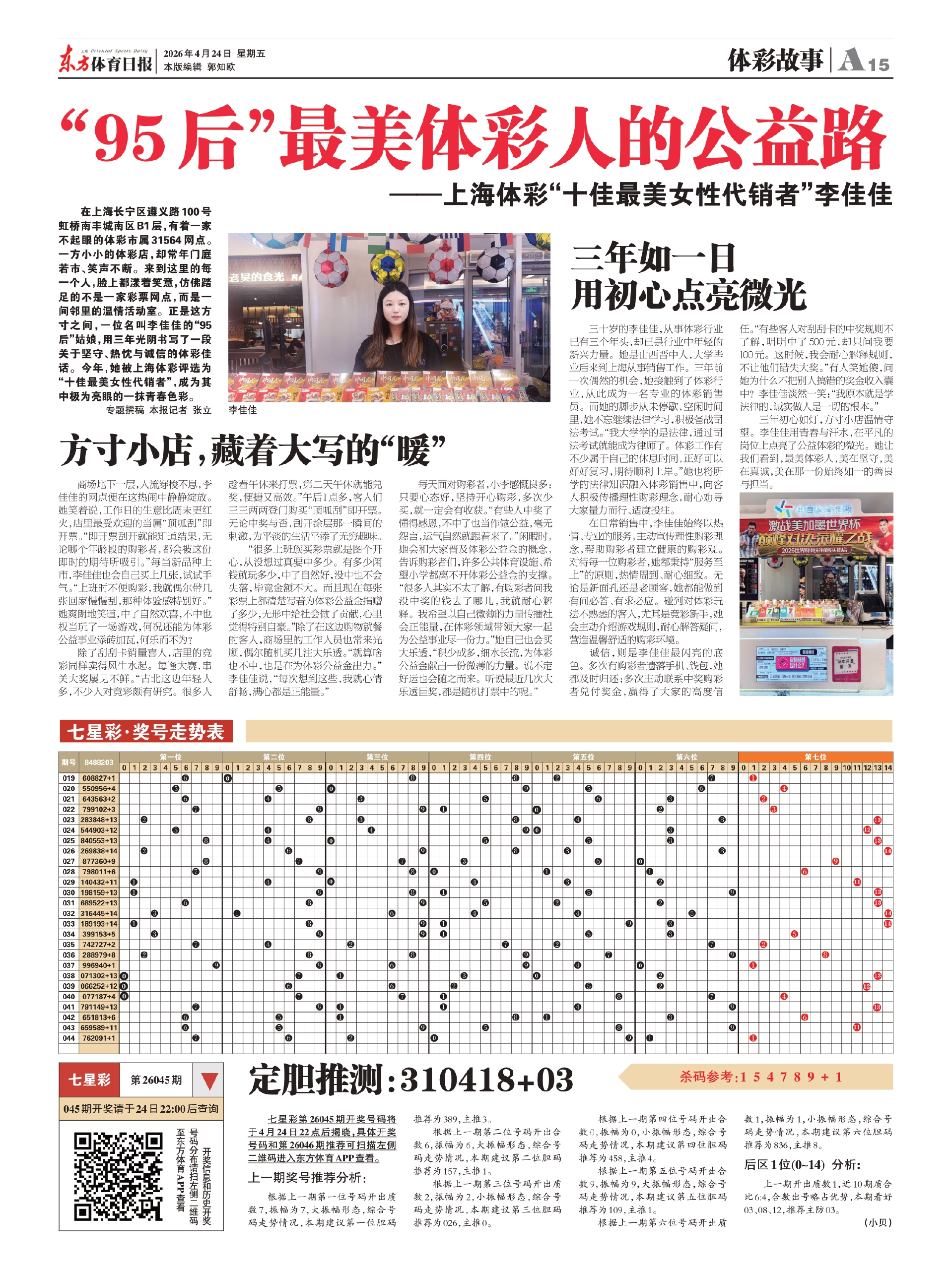 在上海长宁区遵义路100号虹桥南丰城南区B1层,有着一家不起眼的体彩市属31564网点。一方小小的体彩店,却常年门庭若市、笑声不断。来到这里的每一个人,脸上都漾着笑意,仿佛踏足的不是一家彩票网点,而是一间邻里的温情活动室。正是这方寸之间,一位名叫李佳佳的“95后”姑娘,用三年光阴书写了一段关于坚守、热忱与诚信的体彩佳话。今年,她被上海体彩评选为“十佳最美女性代销者”,成为其中极为亮眼的一抹青春色彩。