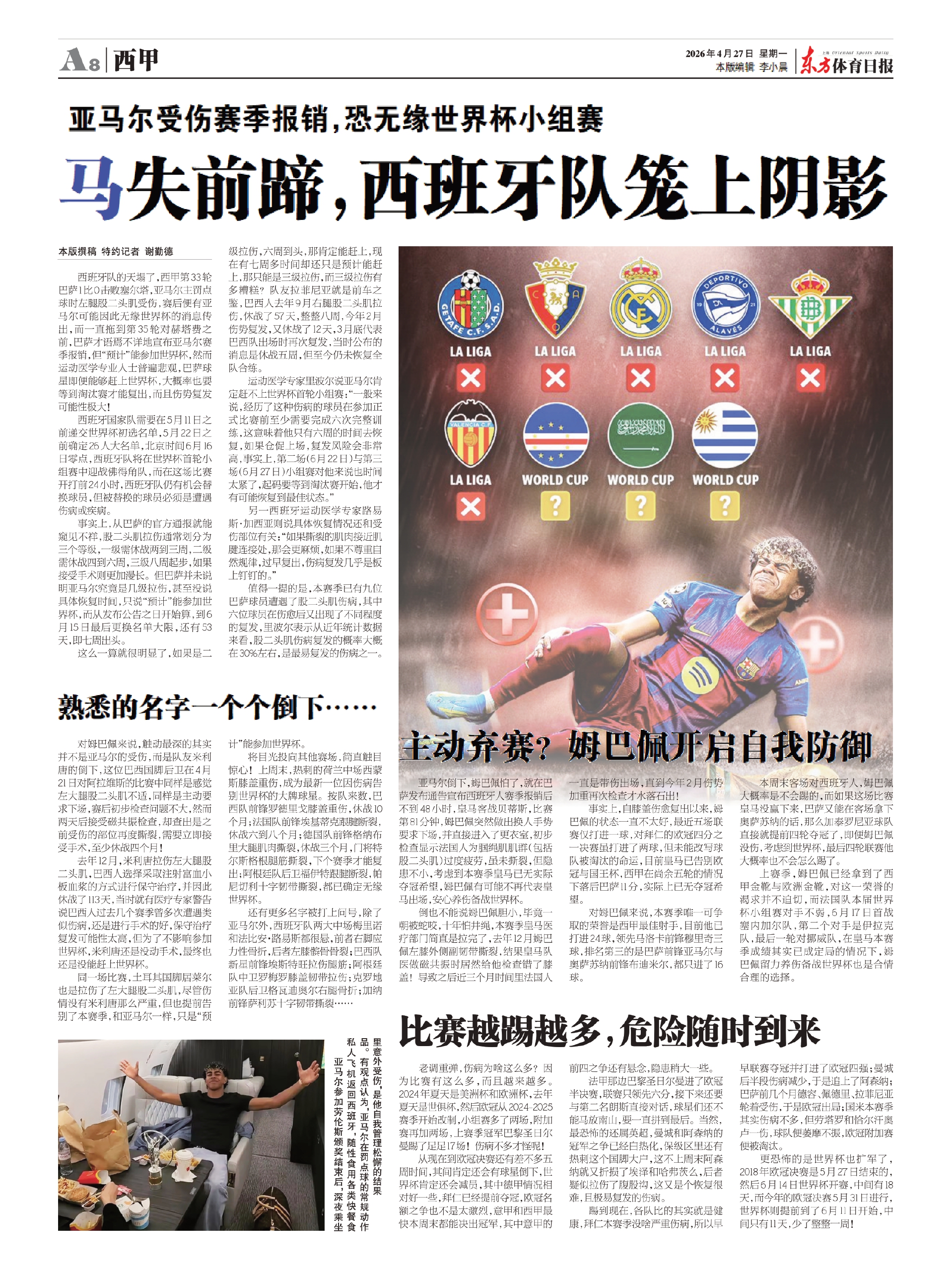 西班牙队的天塌了,西甲第33轮巴萨1比0击败塞尔塔,亚马尔主罚点球时左腿股二头肌受伤,赛后便有亚马尔可能因此无缘世界杯的消息传出,而一直拖到第35轮对赫塔费之前,巴萨才语焉不详地宣布亚马尔赛季报销,但“预计”能参加世界杯,然而运动医学专业人士普遍悲观,巴萨球星即便能够赶上世界杯,大概率也要等到淘汰赛才能复出,而且伤势复发可能性极大!