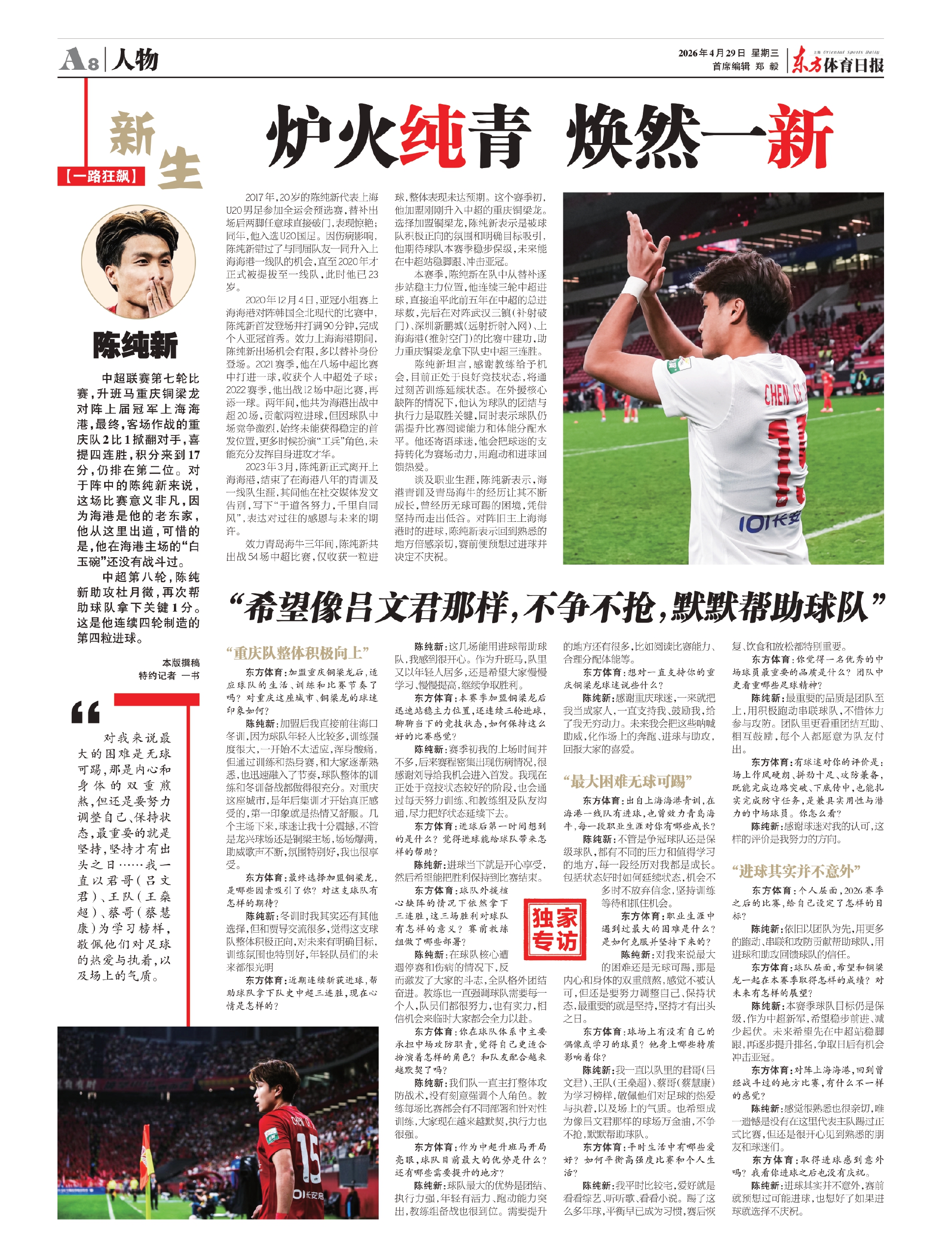 效力青岛海牛三年间,陈纯新共出战54场中超比赛,仅收获一粒进球,整体表现未达预期。这个赛季初,他加盟刚刚升入中超的重庆铜梁龙。选择加盟铜梁龙,陈纯新表示是被球队积极正向的氛围和明确目标吸引,他期待球队本赛季稳步保级,未来能在中超站稳脚跟、冲击亚冠。