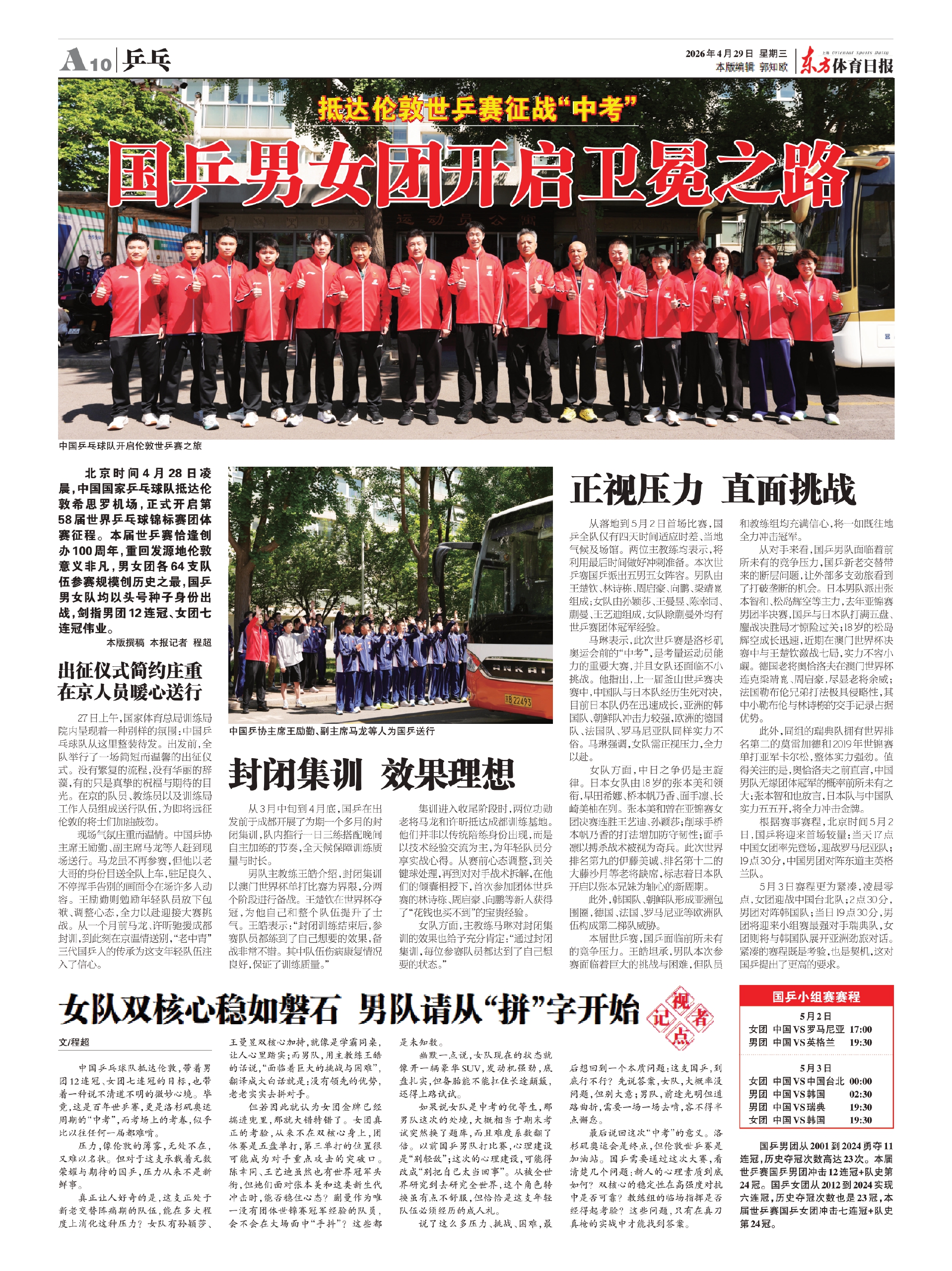 从落地到5月2日首场比赛,国乒全队仅有四天时间适应时差、当地气候及场馆。两位主教练均表示,将利用最后时间做好冲刺准备。本次世乒赛国乒派出五男五女阵容。男队由王楚钦、林诗栋、周启豪、向鹏、梁靖崑组成;女队由孙颖莎、王曼昱、陈幸同、蒯曼、王艺迪组成,女队除蒯曼外均有世乒赛团体冠军经验。
