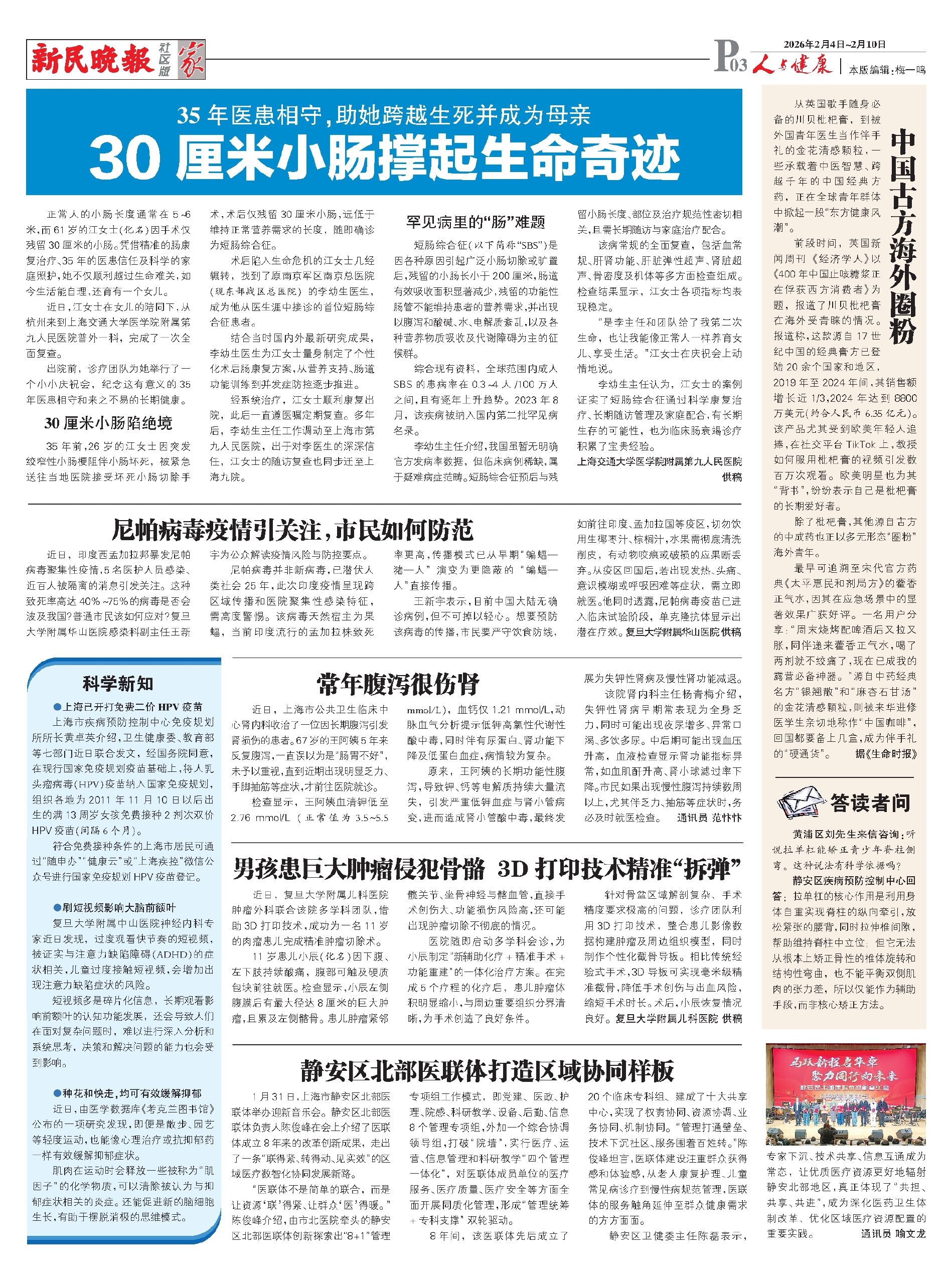 正常人的小肠长度通常在5~6米,而61岁的江女士(化名)因手术仅残留30厘米的小肠。凭借精准的肠康复治疗、35年的医患信任及科学的家庭照护,她不仅顺利越过生命难关,如今生活能自理,还育有一个女儿。