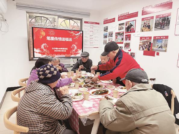 “这道红烧羊肉味道老灵额,比饭店里的还要好吃!”老人们品尝着可口的饭菜,连连夸赞。居委工作人员和老伙伴志愿者们忙着传菜、夹菜、倒热饮,时不时与老人们聊聊养生秘笈,叮嘱他们注意保暖。餐桌旁,两位老党员泼墨挥毫,书写一张张“福”字,连同泰隆银行提供的福袋,一并赠送给每位老人。