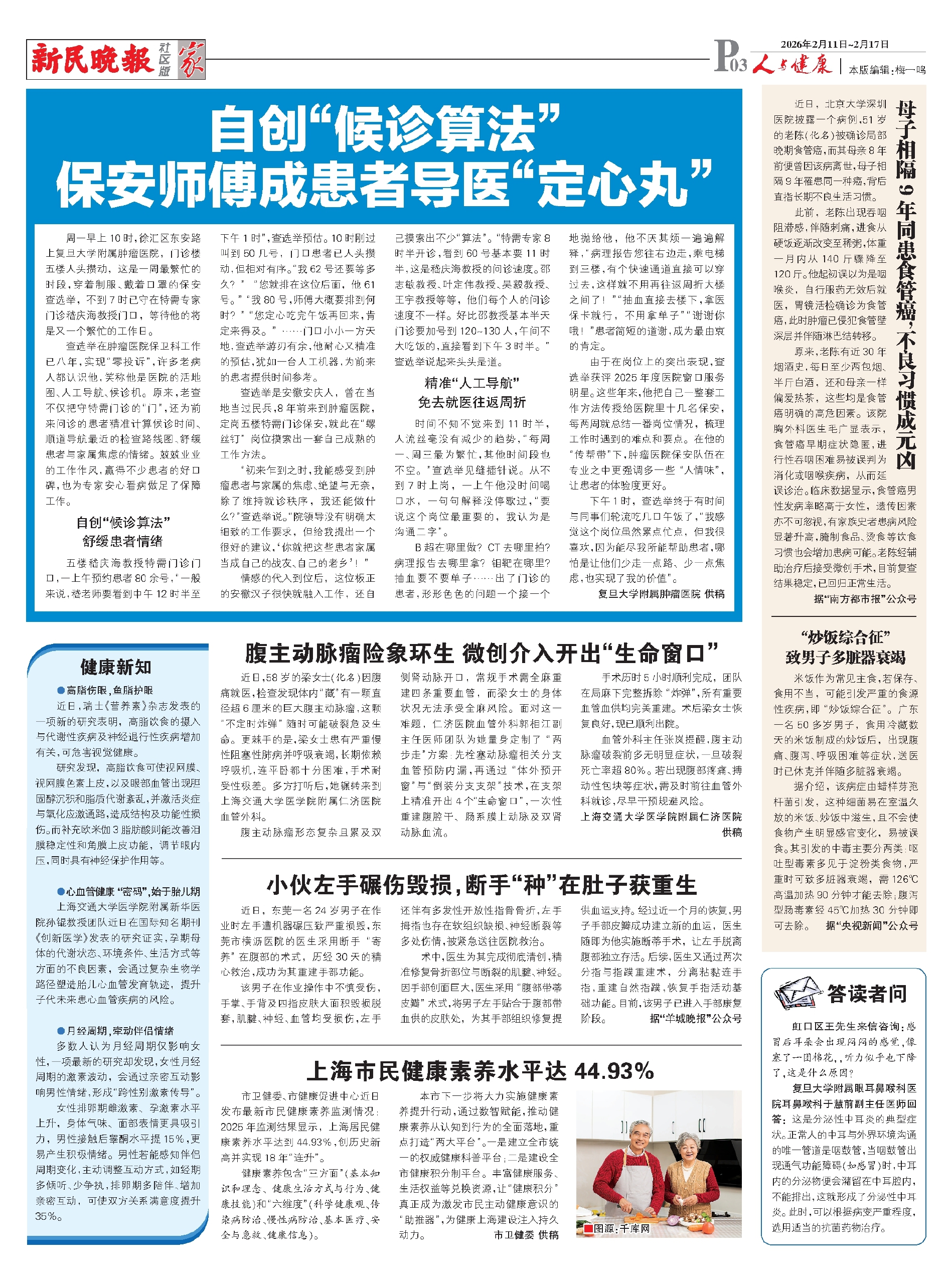 五楼嵇庆海教授特需门诊门口,一上午预约患者80余号,“一般来说,嵇老师要看到中午12时半至下午1时”,查选举预估。10时刚过叫到50几号,门口患者已人头攒动,但相对有序。“我62号还要等多久?”“您就排在这位后面,他61号。”“我80号,师傅大概要排到何时?”“您定心吃完午饭再回来,肯定来得及。”……门口小小一方天地,查选举游刃有余,他耐心又精准的预估,犹如一台人工机器,为前来的患者提供时间参考。