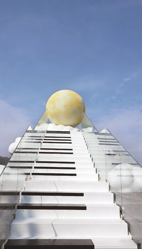 嫦娥奔月,则是景区的另一处网红地标。纯白的阶梯如天梯般向上延伸,顶端的嫦娥雕塑衣袂飘飘,与蓝天白云相映成趣。沿着阶梯拾级而上,仿佛一步步走向天际,站在最高点,整个海棠湖的风光尽收眼底,青山、碧水、田园、村落,构成一幅绝美的全景图。在这里,无论是拍单人照还是合影,都能拍出“手可摘星辰”的浪漫与大气,成为景区最具辨识度的打卡符号。