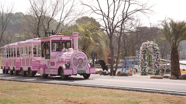 海棠湖是春日的主角,近200亩湖面如翡翠镶嵌在山谷间,湖水澄澈如练,春水初涨时,野鸭率先划过碧波,留下一圈圈涟漪。岸边垂柳抽芽,桃花、樱花次第绽放,与乌桕、三角枫相映成趣。漫步湖岸,浮桥与廊桥蜿蜒如带,漫步其上,看游船悠悠划过,听鸟鸣虫唱,清风拂面间,恍若置身江南水墨画中。环海棠湖的观光小火车是春日的“快乐符号”,色彩鲜艳的车厢穿梭在花海、稻田与林间,载着孩子的欢笑与大人的悠闲,每一站都是春日限定的风景。