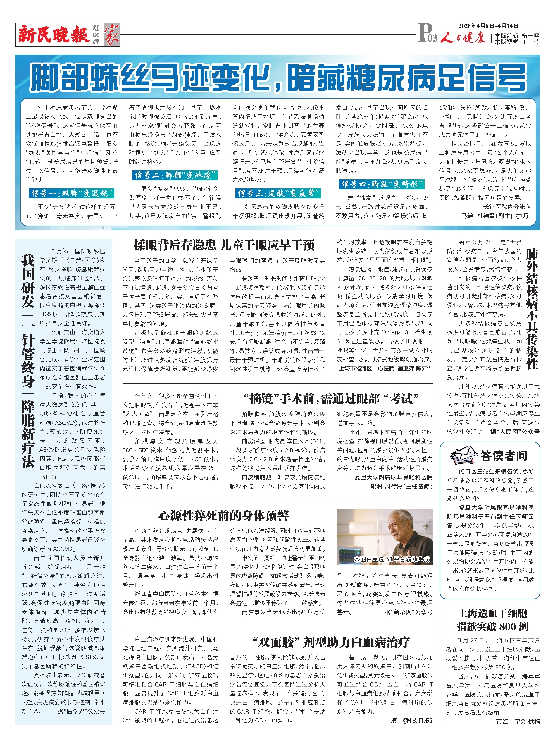 相关资料显示,在我国50岁以上糖尿病患者中,每12个人就有1人面临糖尿病足风险。双脚的“求救信号”从来都不隐蔽,只是人们太容易忽视。对“糖友”来说,护脚和控糖都是“必修课”,发现异常就及时去医院,就能阻止糖尿病足的发展。
