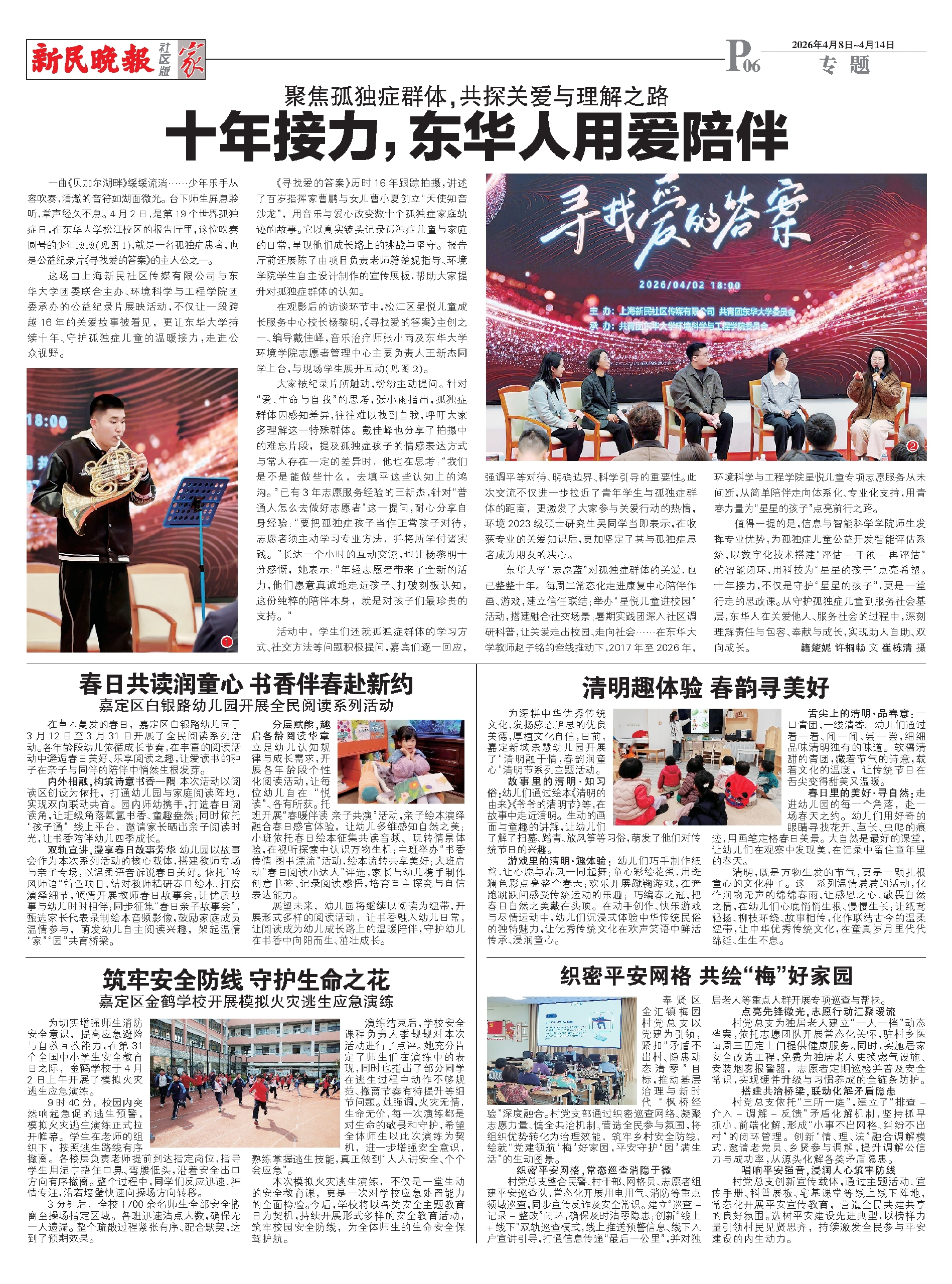 东华大学“志愿蓝”对孤独症群体的关爱,也已整整十年。每周二常态化走进康复中心陪伴作画、游戏,建立信任联结;举办“星悦儿童进校园”活动,搭建融合社交场景;暑期实践团深入社区调研科普,让关爱走出校园、走向社会……在东华大学教师赵子铭的牵线推动下,2017年至2026年,环境科学与工程学院星悦儿童专项志愿服务从未间断,从简单陪伴走向体系化、专业化支持,用青春力量为“星星的孩子”点亮前行之路。