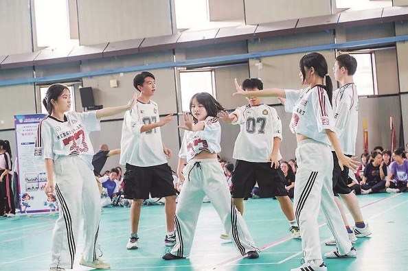 值得一提的是,这堂课并非简单的肢体操练,还融入了压力鞋垫、智能检测系统等智能教学手段,精准捕捉学生动作力度与重心变化等关键数据,助力教师实时掌握学情、及时纠正。学校围绕“技术进阶、能力提升、文化浸润”的核心路径,构建了三年为周期的系统化进阶式学习体系:高一打基础,强化花球啦啦操的节奏统一与团队协作;高二强核心,聚焦技巧啦啦操的多人协同与复杂托举配合;高三重个性,实行自主选学以释放创造力。每年9月举办的校园啦啦操“班班赛”,全员参与、自主编排,已成为凝聚班级力量、展现青春风采的重要平台。学校还组建了校啦啦操队,积极参与各级各类赛事,斩获奖项颇丰,其中包括2022~2023年全国啦啦操联赛(上海闵行站)公开少年甲组街舞规定动作第一名、2025年该赛事公开少年混合组街舞规定动作第一名等,用实力展现了上闵外学子的活力与风采。