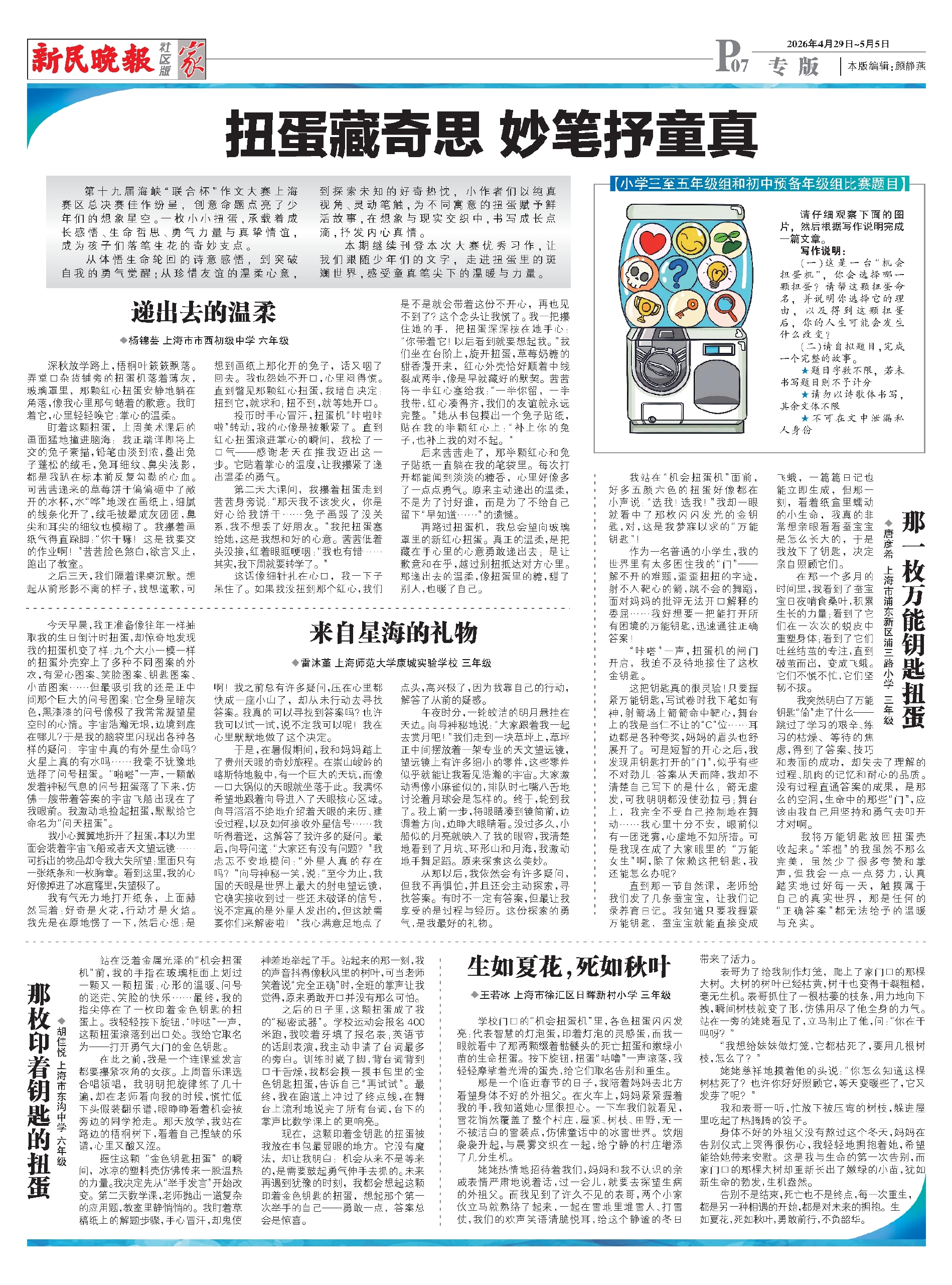 本期继续刊登本次大赛优秀习作,让我们跟随少年们的文字,走进扭蛋里的斑斓世界,感受童真笔尖下的温暖与力量。