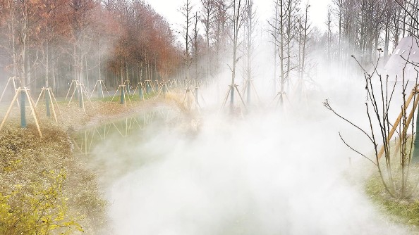 采访当天恰逢微雨,浦东横沔公园水上森林笼罩在蒙蒙雨雾中。杉林虽已过观赏期,仍能看到橙红交织着深褐,工人正将落叶扫成堆,准备进行绿化废弃物二次利用。走在蜿蜒的木栈道上,只听雨水滴答与鸟鸣虫吟声,世界格外静谧。中央浮岛上,雾森不时开放,仿似蓬莱仙境。