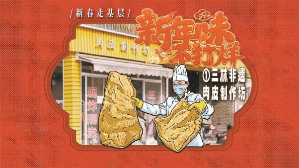 “春节前是最忙碌的,尤其这几天是高峰期,一天能卖出100多斤肉皮。”早上8时刚过,三林非遗肉皮制作坊就忙碌起来,薛金祥起锅烧油,马不停蹄地炸制,一张张金黄酥脆的肉皮新鲜出炉。购买年货的市民也早早前来,有人预订5斤,有人专程从杨浦慕名而来,“三林肉皮有名,过年尝尝鲜”。