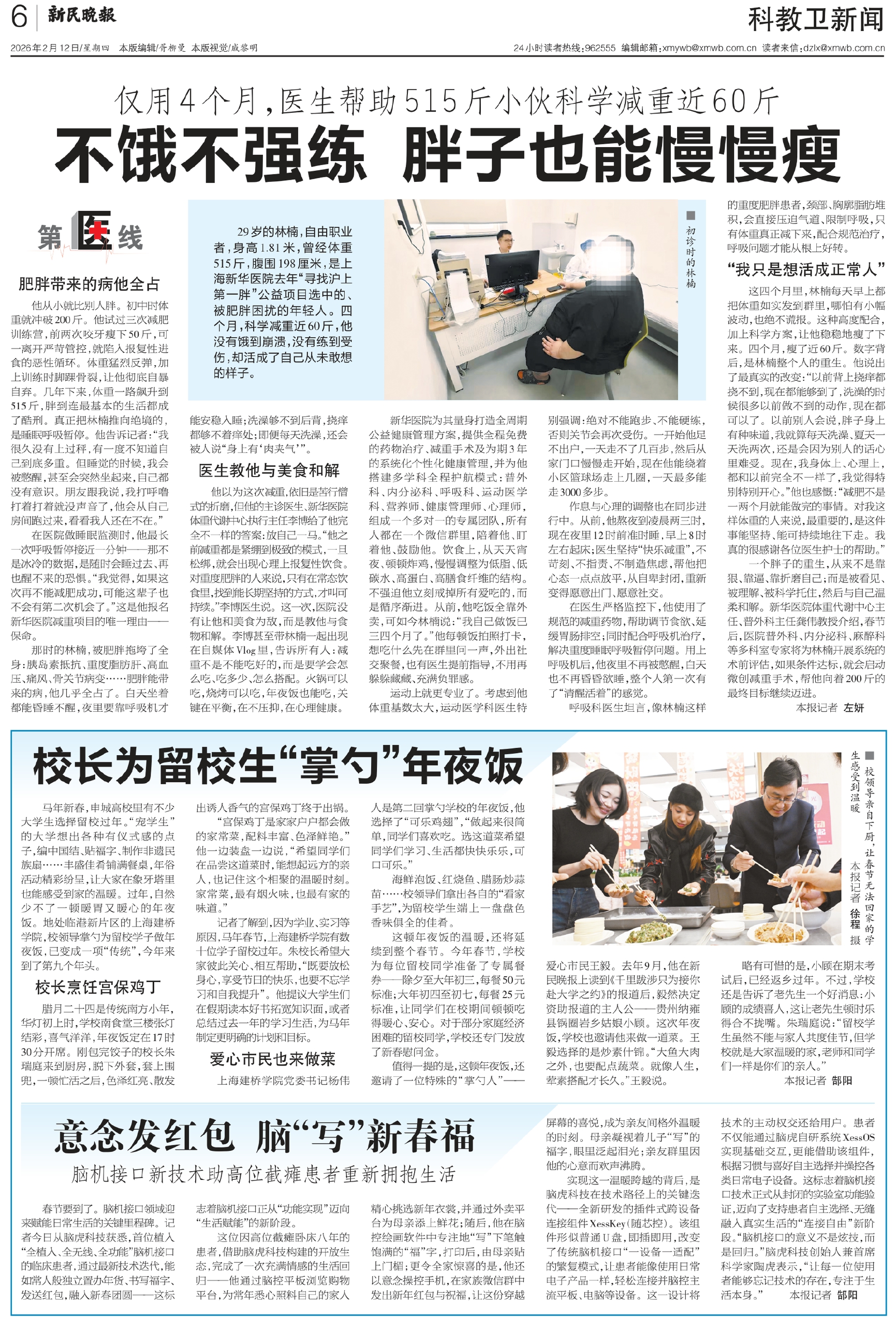 一个胖子的重生,从来不是靠狠、靠逼、靠折磨自己;而是被看见、被理解、被科学托住,然后与自己温柔和解。新华医院体重代谢中心主任、普外科主任龚伟教授介绍,春节后,医院普外科、内分泌科、麻醉科等多科室专家将为林楠开展系统的术前评估,如果条件达标,就会启动微创减重手术,帮他向着200斤的最终目标继续迈进。