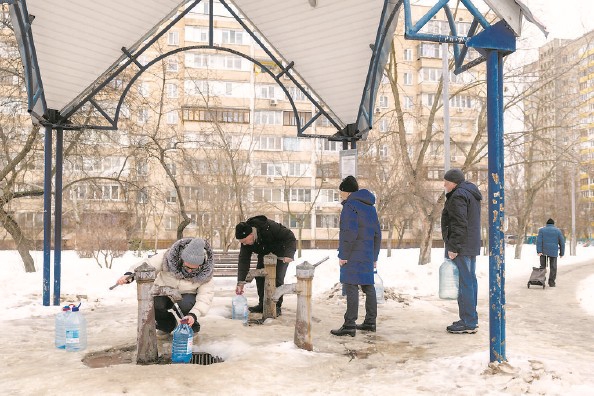 遭受俄方袭击后,乌克兰首都基辅部分地区断水,居民在公共水井取水 本版图片IC