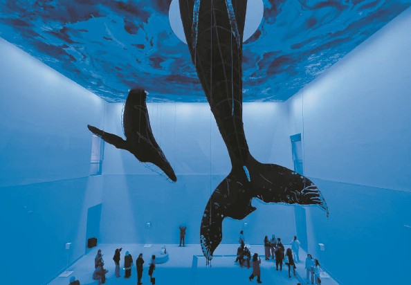 浦东美术馆的中央展厅已经化为幽蓝海域,哥伦比亚艺术家卡罗莱娜·凯塞多的个展《鲸鱼的致敬》在此呈现。两只与真实尺寸等大的座头鲸悬停于半空,一雌一雄。它们曾是海洋污染的亲历者,体内残留着渔网与毒素。然而艺术家并未直接展示伤痕,而是从上海本土挑选珠饰、流苏、亮片,以数月时间装点鲸鱼柔软的腹部。观展也不是一个沉默的过程。全长22分钟的音乐缓缓铺开,时长恰好接近一头雄性座头鲸单次歌唱的平均长度。鲸鱼的呼唤与应答,摩托艇的嗡鸣,水下环境音潮汐涨落,多重节奏交织成声音剖面图。展厅灯光随声景同步流转。从“午夜蓝”到“白昼日光”,色调在22分钟一循环的周期里缓慢推移。这是鲸鱼在深海觅食与浮出海面呼吸之间的垂直律动——下潜,停留,上浮,换气,再下潜。