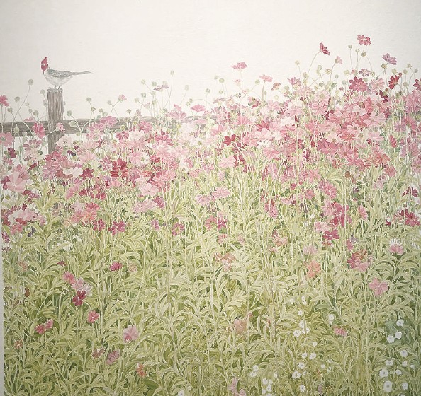 刘海粟美术馆推出的“花开有时——鲍莺作品展”,为古典山水注入当代都市的诗意。鲍莺是生于上海的70后画家。她的画面保留宋人山水的结构骨架,却以绯红、石绿、鹅黄重新皴染峰峦。山脚下,高速公路隔音板静静伫立;树梢间,摩天轮缓缓转动;灌木丛里,藏着小狐狸、仓鼠与长耳兔——那是她为细心的观众预留的惊喜。