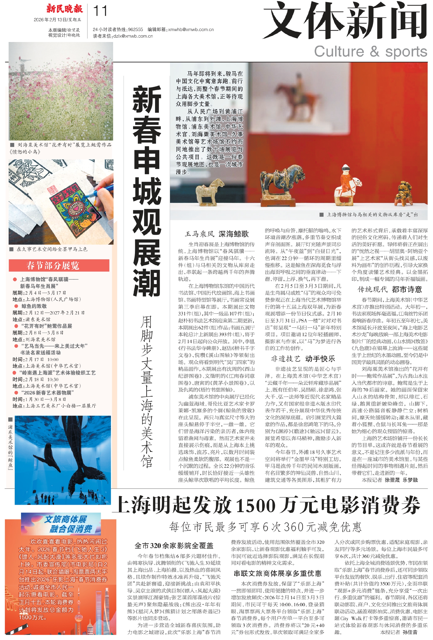 从人民广场到黄浦江畔,从浦东到外滩,上海博物馆、浦东美术馆、中华艺术宫、刘海粟美术馆、久事美术馆等艺术场馆不约而同地推出了数十场展览与公共项目。这既是一份春节观展地图,也是一次城市漫步。